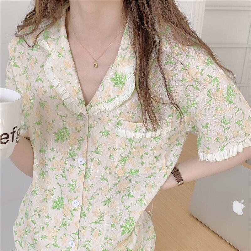 ルームウェア レディース 上下セット パジャマ 半袖 部屋着 花柄 フラワー ボタニカル フリル かわいい 大人可愛い カジュアル 清楚 フェミニン おしゃれ 綺麗 お嬢様 こなれ感 ラフ ラブリー キュート ガーリー ルーズ ナチュラル リラックス アンティーク 抜け感 華やか 存在感 主役級 無地 花 お泊まり 休日 旅行 休暇 フリーサイズ グリーン 緑 ピンク 春 夏 2点セット ツーピース 10代 20代 30代 韓国 韓国系 体型カバー 楽ちん モテ ギフト プレゼント トレンド 送料無料