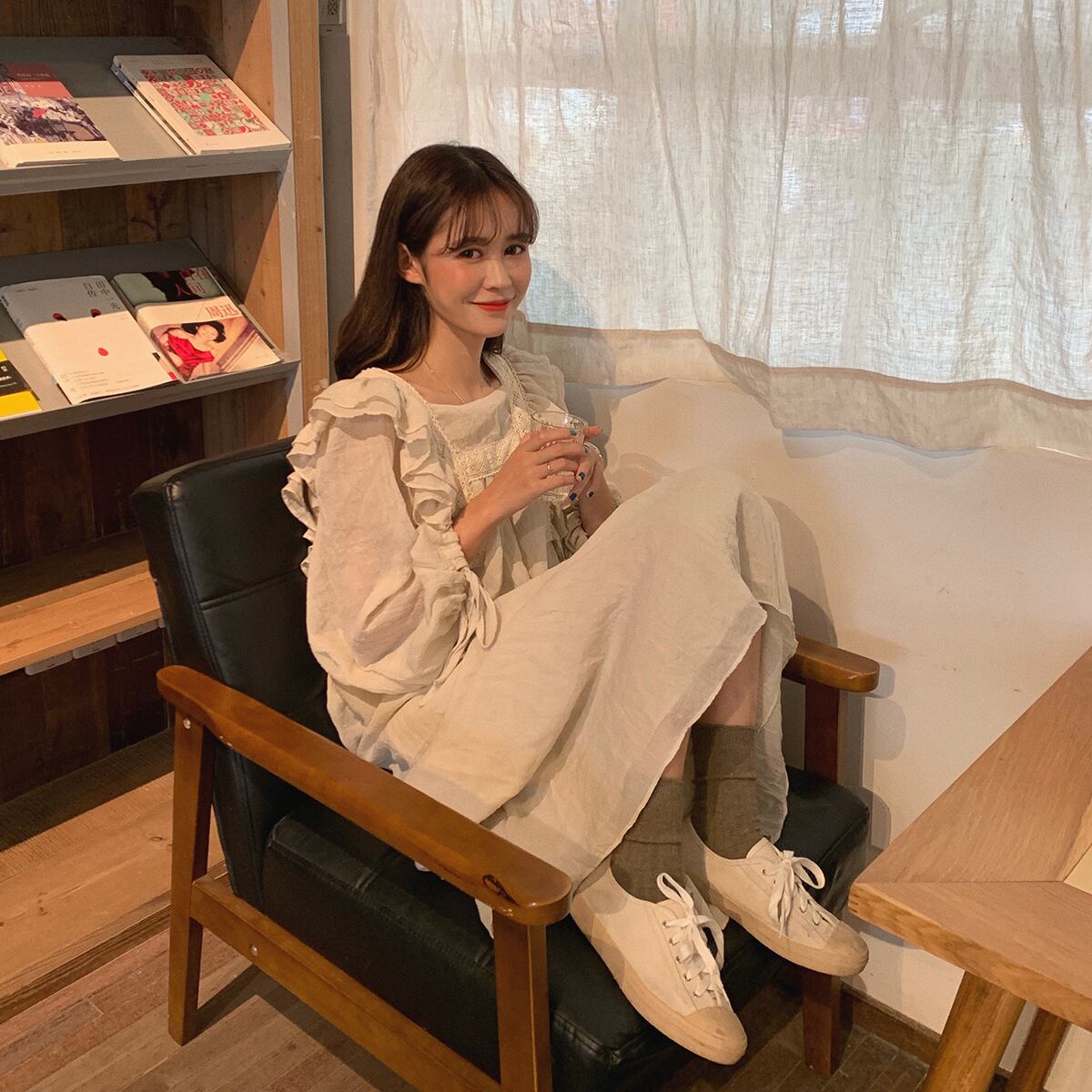 肩フリルがポイントのゆったりしたロングワンピース。
