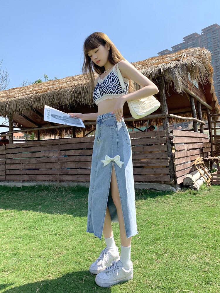 スリットのリボンがキュートなデニムスカート。
