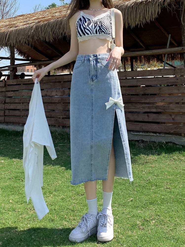 スカート レディース デニムスカート XS S M L XL 2XL スリット ミディアム丈 サイドスリット リボン ハイウエスト ポケット デニム 大人可愛い シンプル カジュアル おしゃれ お洒落 ラブリー キュート ガーリー ストリート セクシー ナチュラル こなれ感 ラフ 個性的 リラックス 抜け感 存在感 無地 デート お出かけ 休日 リゾート 旅行 散歩 カフェ巡り 街歩き ショッピング ブルー 10代 20代 30代 韓国 韓国系 着回し 普段使い 美脚 コーデ モテ 送料無料 インスタ映え