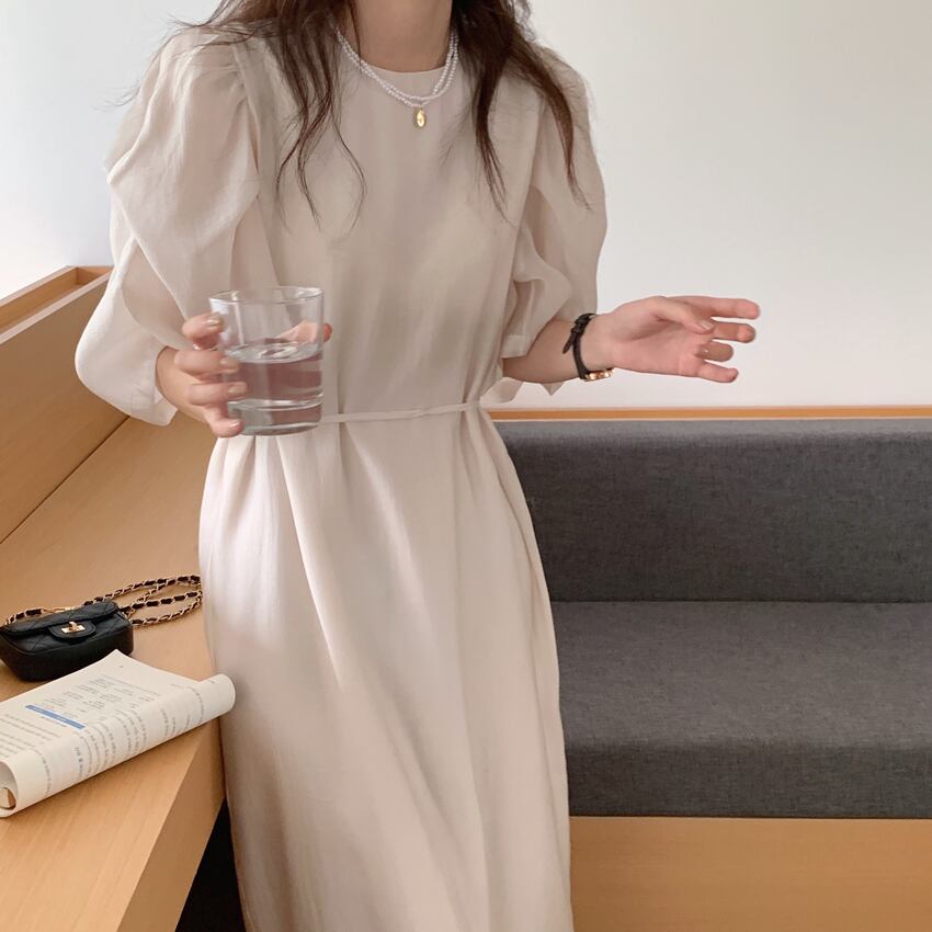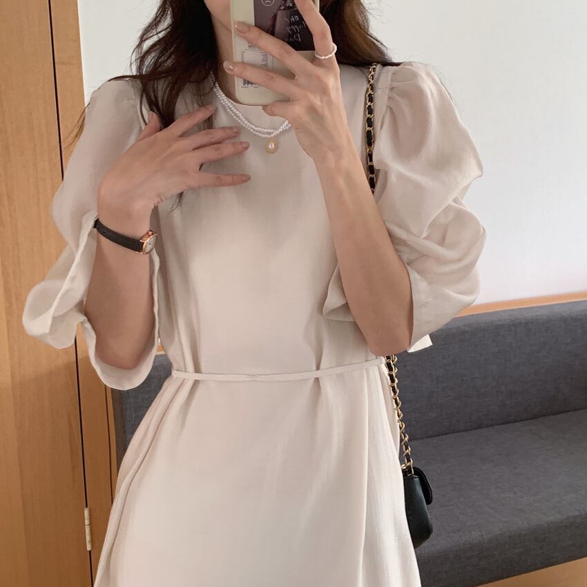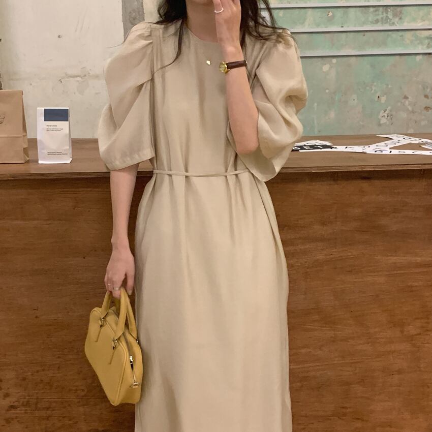 ワンピース レディース ロングワンピース ロング丈 5分袖 パフスリーブ ラウンドネック スリム Iライン ハイウエスト かわいい 大人可愛い きれいめ シンプル 上品 エレガント 清楚 おしゃれ おとな キュート ガーリー レトロ 華やか 無地 デート お出かけ 女子会 パーティー イベント 美術館巡り アート鑑賞 コンサート フリーサイズ ベージュ アプリコット ブルー 春 夏 秋 結婚式 二次会 披露宴 演奏会 20代 30代 40代 ママ 韓国系 着回し 楽ちん ファッション モテ 送料無料