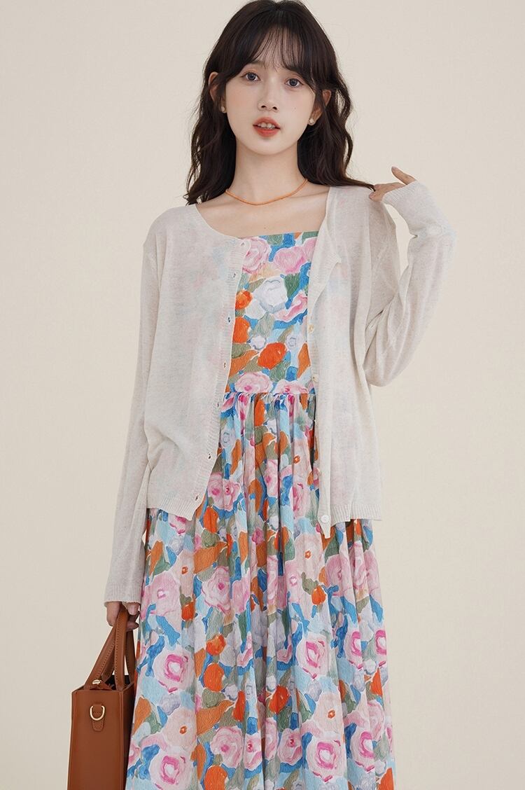 ハリのある生地感でサラっと着られるキャミソールワンピース♪裏地なし、肩紐にアジャスターがついているので長さも調節可能です♪一番短く調節して163cmで丈感はふくらはぎ真ん中あたりです。カーディガンと合わせても中にTシャツを着ても◎やや大きいかな?と思いましたが、肩紐を調節すると1枚でも違和感ないサイズ感となります♪華やかなデザインで旅行に行きたくなるアイテム♡