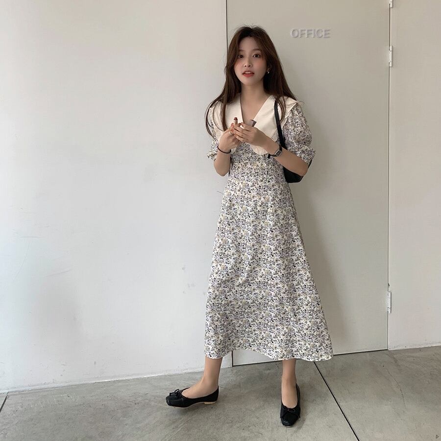 【着用レビュー】ワンピース レディース フレアワンピース ロングワンピース ロング ロング丈 袖あり 半袖 5分袖 五分袖 ボリューム袖 パフスリーブ Vネック 襟付き ビッグカラーフレア Aライン かわいい 大人可愛い きれいめ 上品 エレガント 清楚 おしゃれ お嬢様 おとな ナチュラル ガーリー 爽やか 花柄 小花柄 フラワー オフィス ビジネス OL 通勤 学生 通学 女子会 S M L XL 春 夏 秋 食事会 入学式 卒業式 二次会 10代 20代 30代 韓国系 楽ちん 送料無料