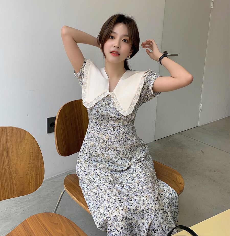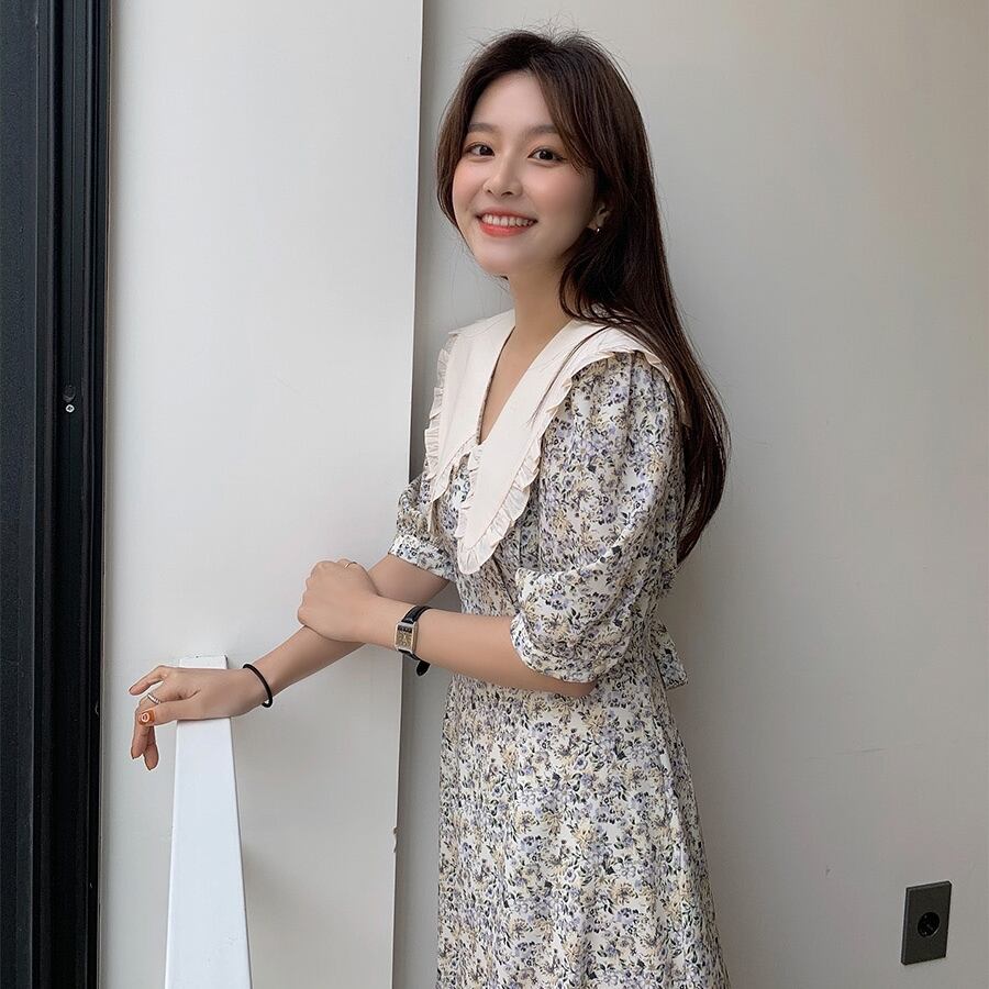 五分袖がきれいなフレアワンピースです♪花柄はお写真よりも黄色味?ベージュ味がある感じでした。バックファスナーで裏地あり(膝上丈)、肩幅も丁度良く、163cmで丈感はふくらはぎ辺りです。ウエストリボンを結ぶときれいな形でおすすめです。白のビッグカラーで顔回りが明るくなります★韓国ガーリーが好きな方におすすめのワンピース♪