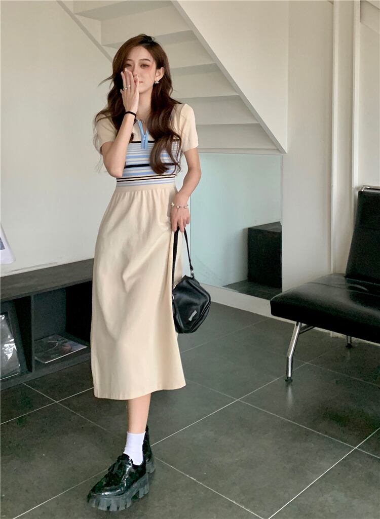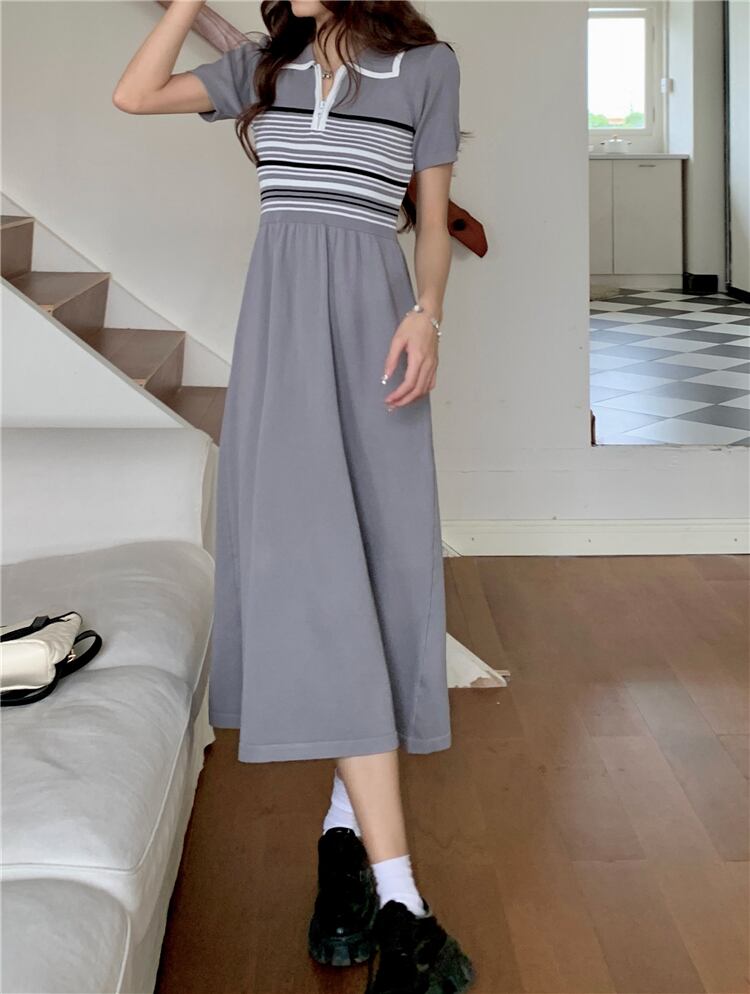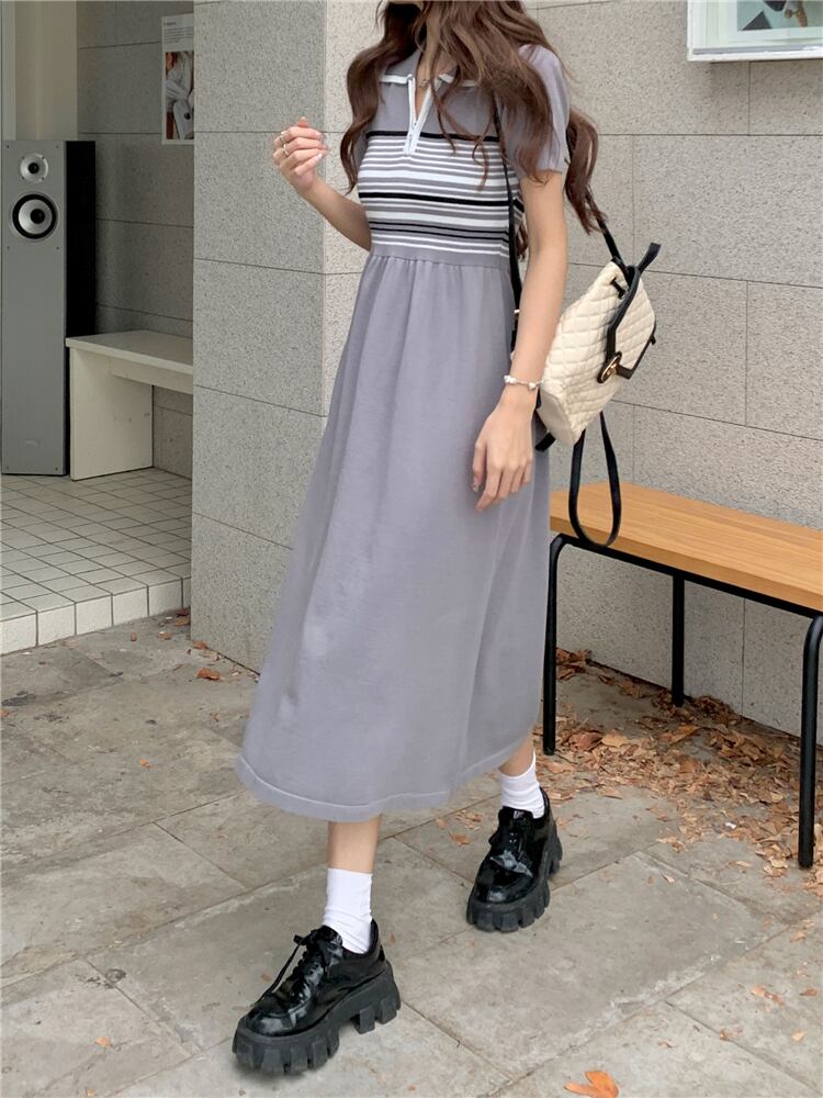 ワンピース レディース 送料無料 2色 ロングワンピース ミモレ ミモレ丈 半袖 襟付き かわいい 大人可愛い カジュアル 清楚 おしゃれ お洒落 ストリート おとな ナチュラル こなれ感 スポーティー ラブリー キュート 個性的 抜け感 華やか 主役級 存在感 無地 ボーダー ストライプ 学生 通学 デート お出かけ 女子会 休日 散歩 カフェ巡り 街歩き フリーサイズ ベージュ グレー 春 夏 10代 20代 30代 韓国 韓国系 着回し 普段使い モテ トレンド 流行 インスタ映え