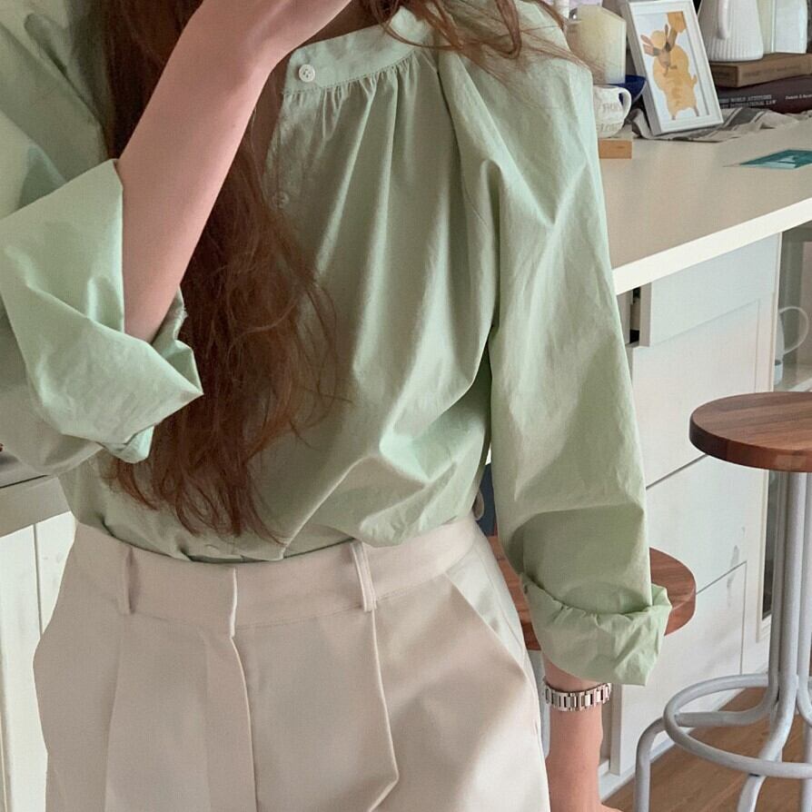 トップス レディース 2色 シャツ 長袖 ボリューム袖 ラウンドネック ストレート ボタン とろみ感 かわいい 大人可愛い きれいめ シンプル カジュアル エレガント おしゃれ 綺麗 おとな ナチュラル こなれ感 ラフ キュート ガーリー ルーズ 華やか 無地 通勤 学生 通学 デート お出かけ 女子会 休日 リゾート 旅行 散歩 カフェ巡り 街歩き フリーサイズ ゆる ピンク グリーン 春 夏 10代 20代 30代 ママ 韓国系 着回し 普段使い 体型カバー ファッション コーデ モテ 流行 送料無料