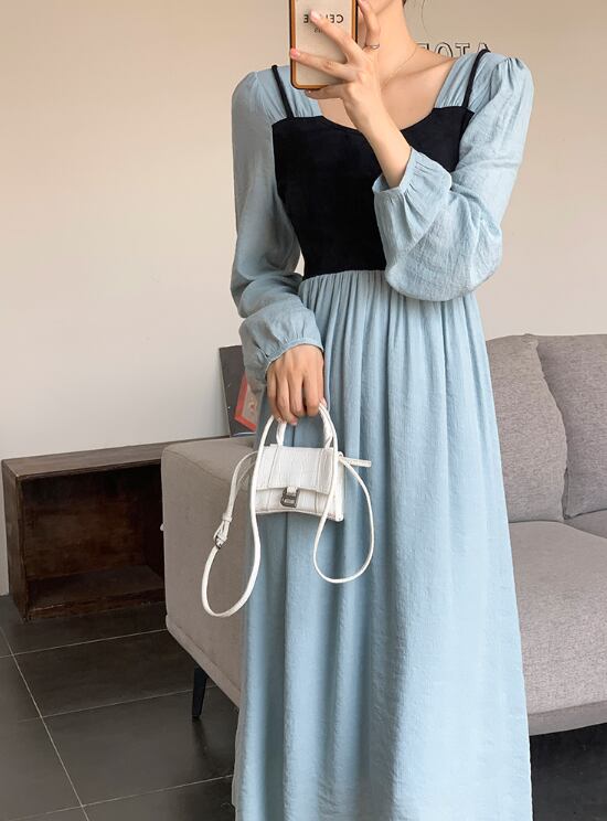 ワンピース レディース フレアワンピース ドッキングワンピース 膝下 ミモレ丈 ロング丈 袖あり 長袖 スクエアネック フレア Aライン ドッキング ハイウエスト かわいい 大人可愛い きれいめ シンプル 上品 清楚 フェミニン おしゃれ お洒落 綺麗 お嬢様 ナチュラル ラブリー キュート ガーリー 爽やか OL 通勤 学生 通学 デート お出かけ 女子会 旅行 S M L XL ブルー 水色 春 夏 秋 食事会 二次会 10代 20代 韓国系 楽ちん 脚長 定番 ファッション コーデ モテ 送料無料
