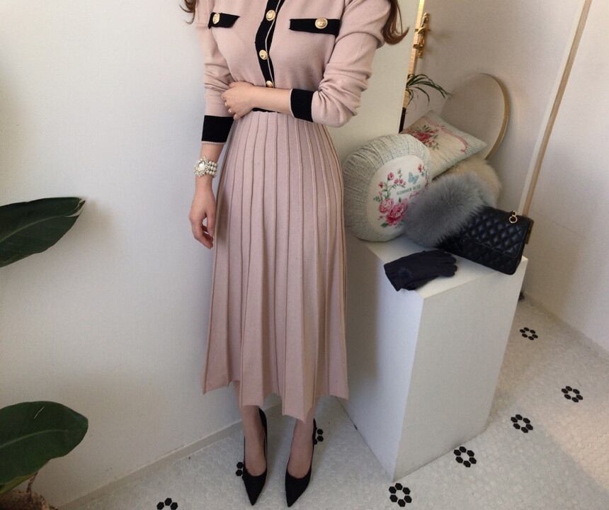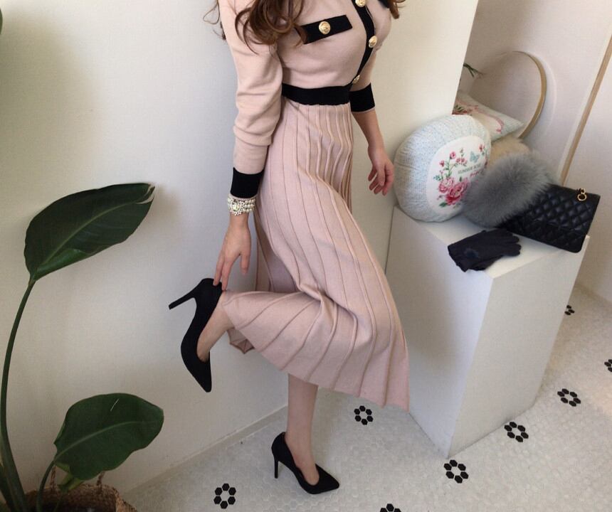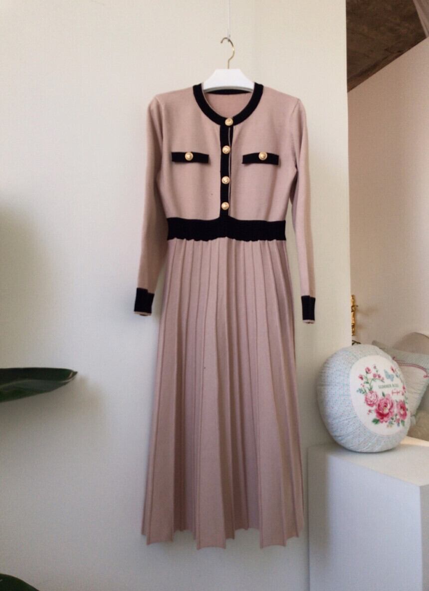 ワンピース レディース ニットワンピース フリーサイズ ピンクベージュ 長袖 無地 ニット セーター クルーネック バイカラー ゴールドボタン バックリボン バックコンシャス フレア ハイウエスト スタイルアップ 脚長効果 シンプル きれいめ カジュアル フェミニン ガーリー キュート 大人可愛い おしゃれ 普段使い イベント デート お出かけ 女子会 休日 旅行 通勤 通学 着まわし 存在感 ファッション コーデ スタイル モテ 10代 20代 30代 40代 春 秋 送料無料