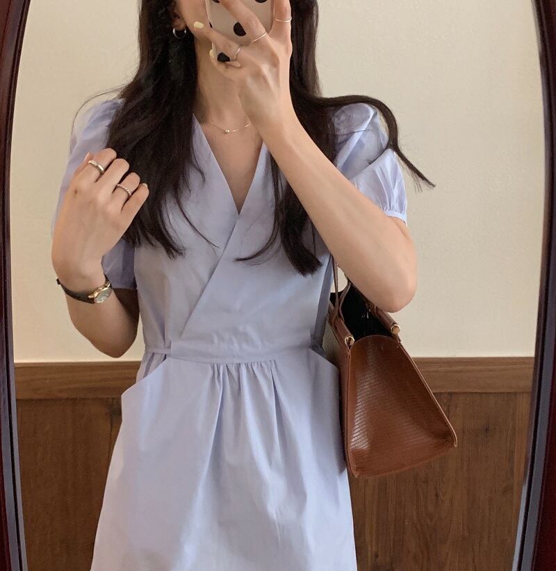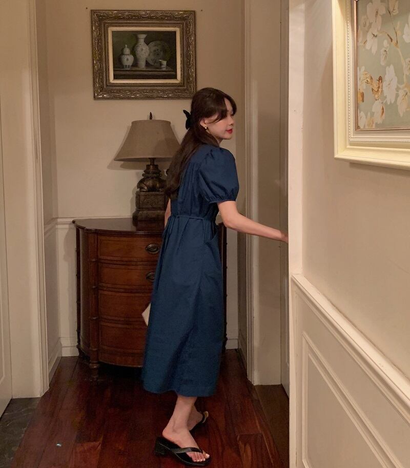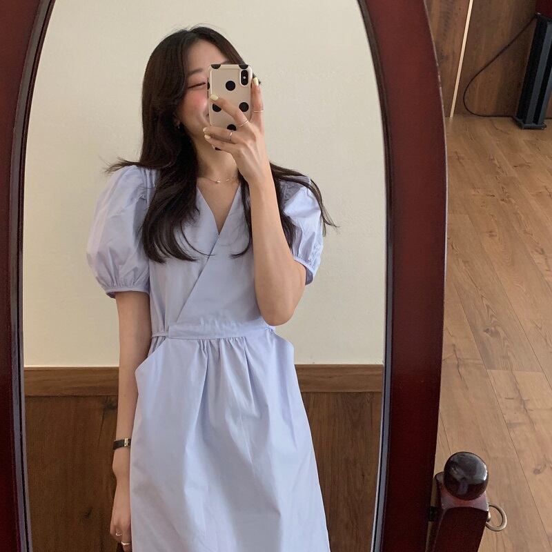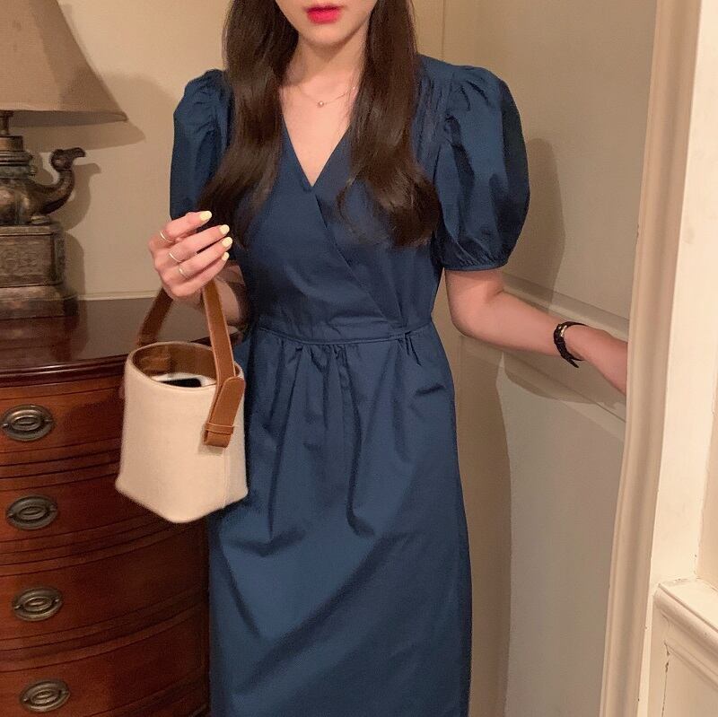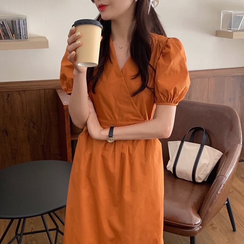 ワンピース レディース 3色 ロングワンピース ミモレ ミモレ丈 半袖 パフスリーブ Vネック かわいい 大人可愛い きれいめ カジュアル 上品 清楚 フェミニン おしゃれ お洒落 綺麗 お嬢様 ナチュラル こなれ感 ラブリー キュート ガーリー リラックス レトロ ロマンチック 爽やか 主役級 存在感 無地 学生 通学 デート お出かけ 女子会 カフェ巡り お買い物 フリーサイズ ブルー ネイビー オレンジ 夏 20代 30代 40代 ママ 韓国 韓国系 着回し 普段使い 送料無料