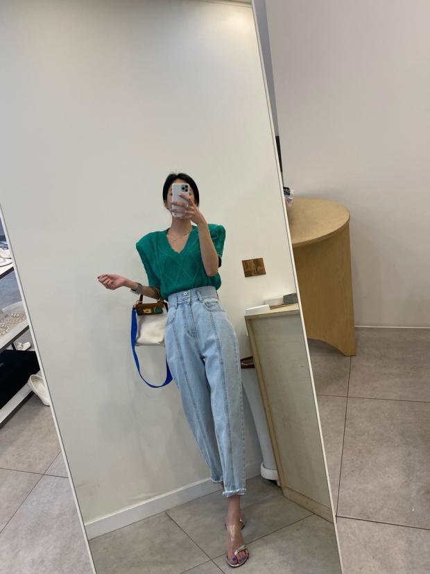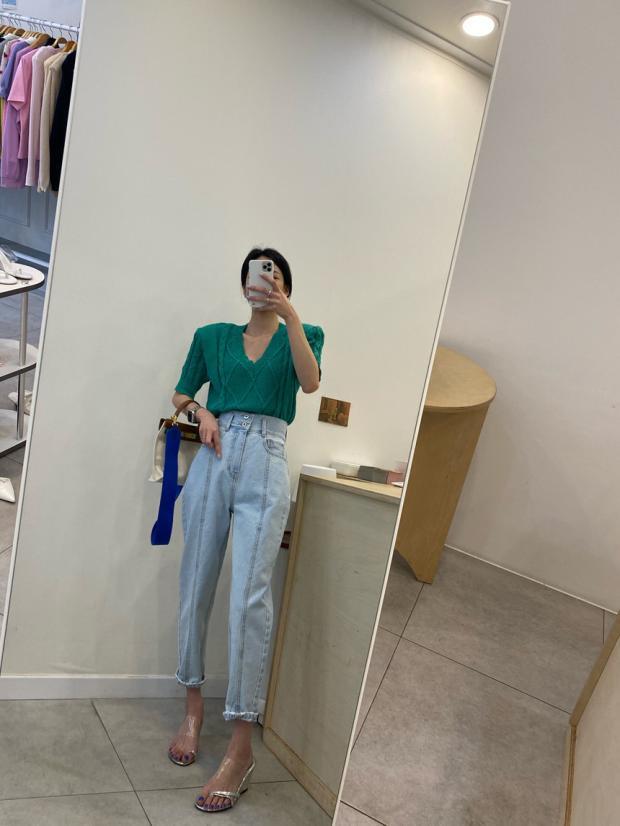 ハイウエストのダブルのボタンデザインがおしゃれなカラーデニム!