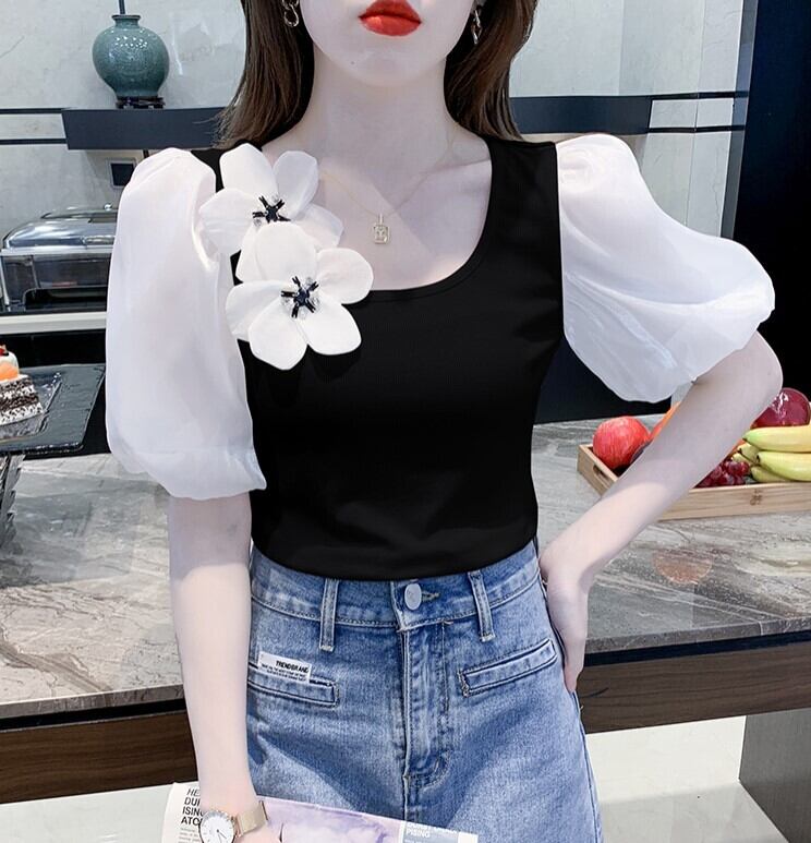 トップス レディース 送料無料 2色 Tシャツ カットソー 半袖 パフスリーブ スリム かわいい 大人可愛い きれいめ シンプル カジュアル 上品 エレガント フェミニン シック おしゃれ お洒落 かっこいい クール セクシー おとな ラブリー キュート ガーリー レトロ ロマンチック 抜け感 主役級 存在感 フラワー 学生 通学 デート お出かけ 女子会 リゾート S M L XL ホワイト 白 ブラック 黒 夏 20代 30代 40代 韓国 韓国系 着回し 普段使い モテ トレンド 流行 インスタ映え
