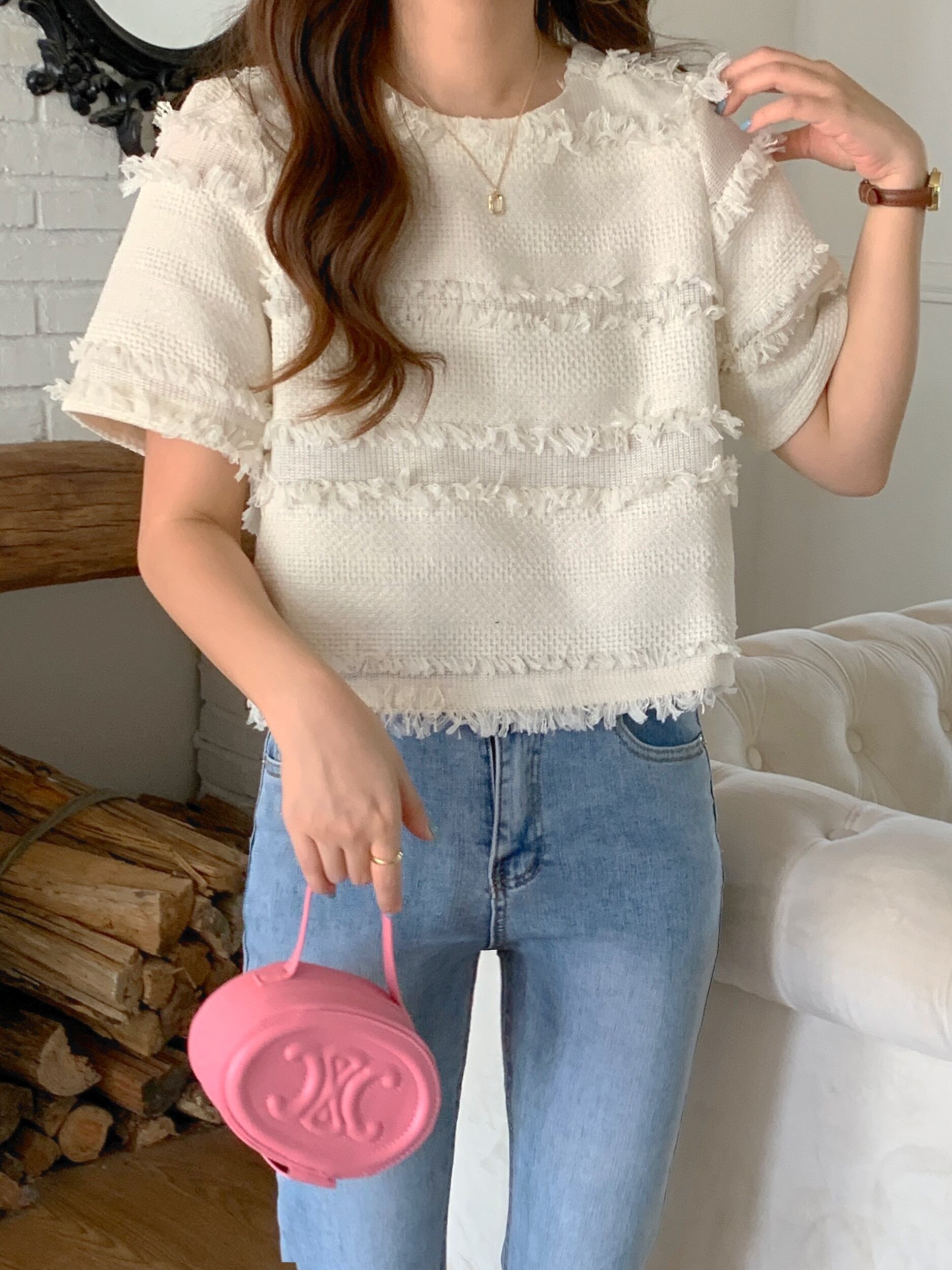 トップス レディース Tシャツ カットソー ミニ丈 ショート丈 クロップド丈 半袖 ラウンドネック ワイド ゆったり フリンジ ツイード とろみ感 かわいい 大人可愛い きれいめ シンプル カジュアル シック おしゃれ 綺麗 モード系 おとな ナチュラル こなれ感 ラフ キュート ガーリー モダン 抜け感 主役級 OL 通勤 学生 デート お出かけ 女子会 休日 フリーサイズ ベージュ ブラック 春 夏 10代 20代 30代 40代 韓国 韓国系 着回し 普段使い 楽ちん ファッション モテ 送料無料