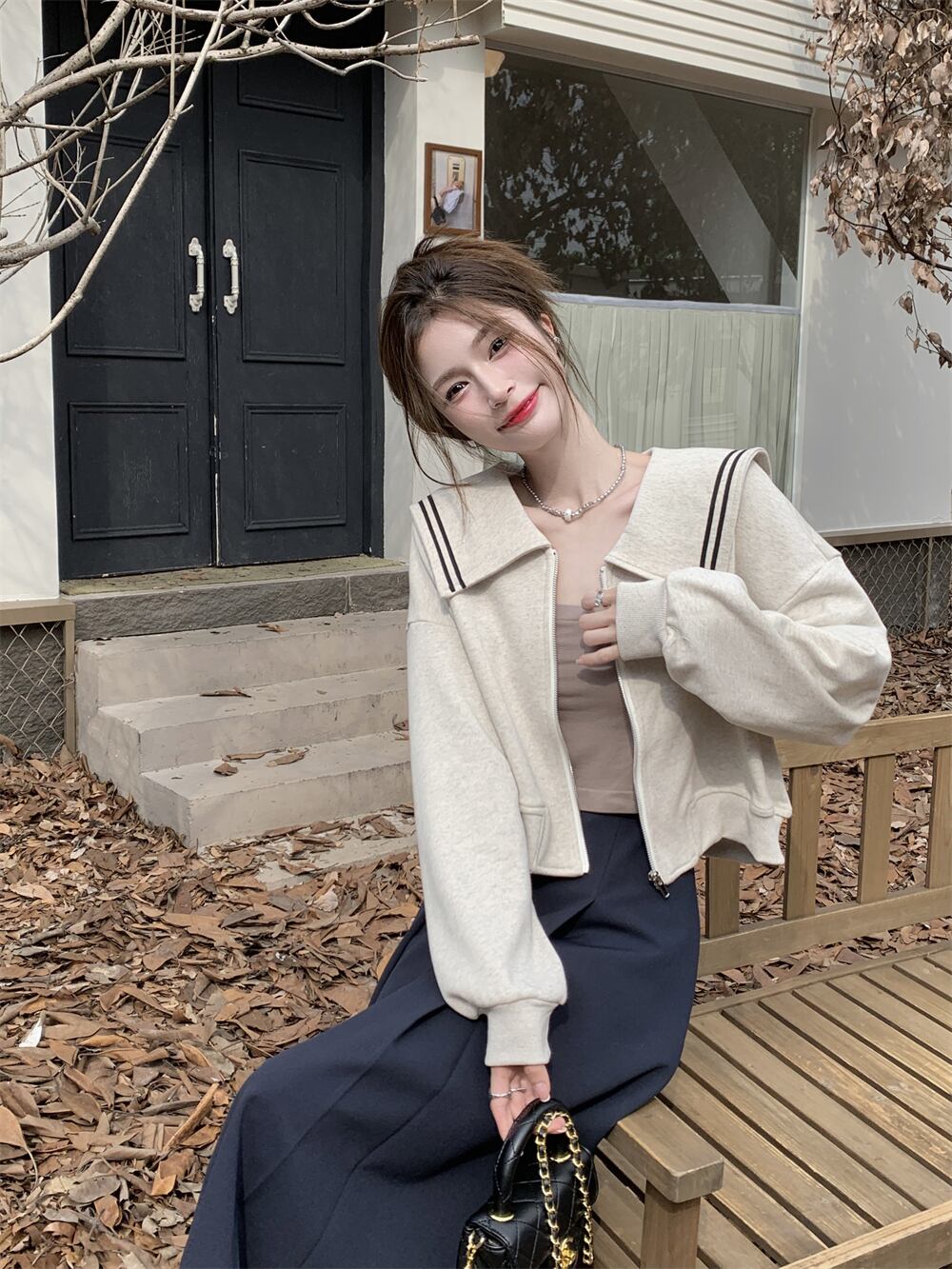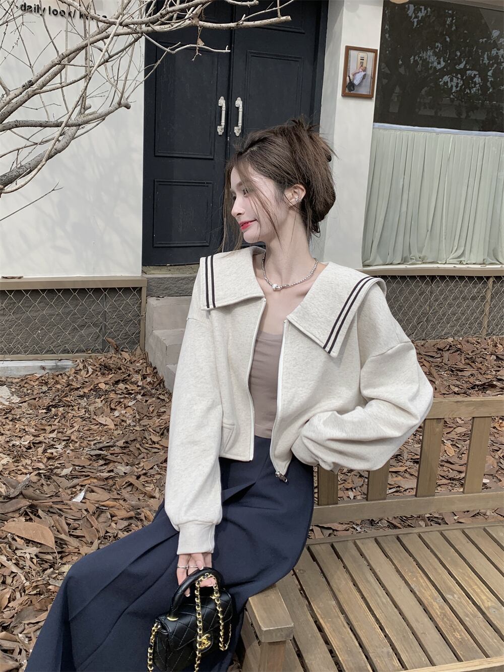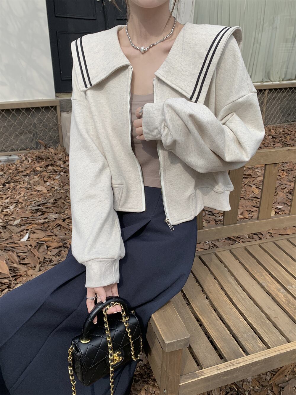 セーラーカラーが可愛い着回し抜群なジップアップカーディガン。
