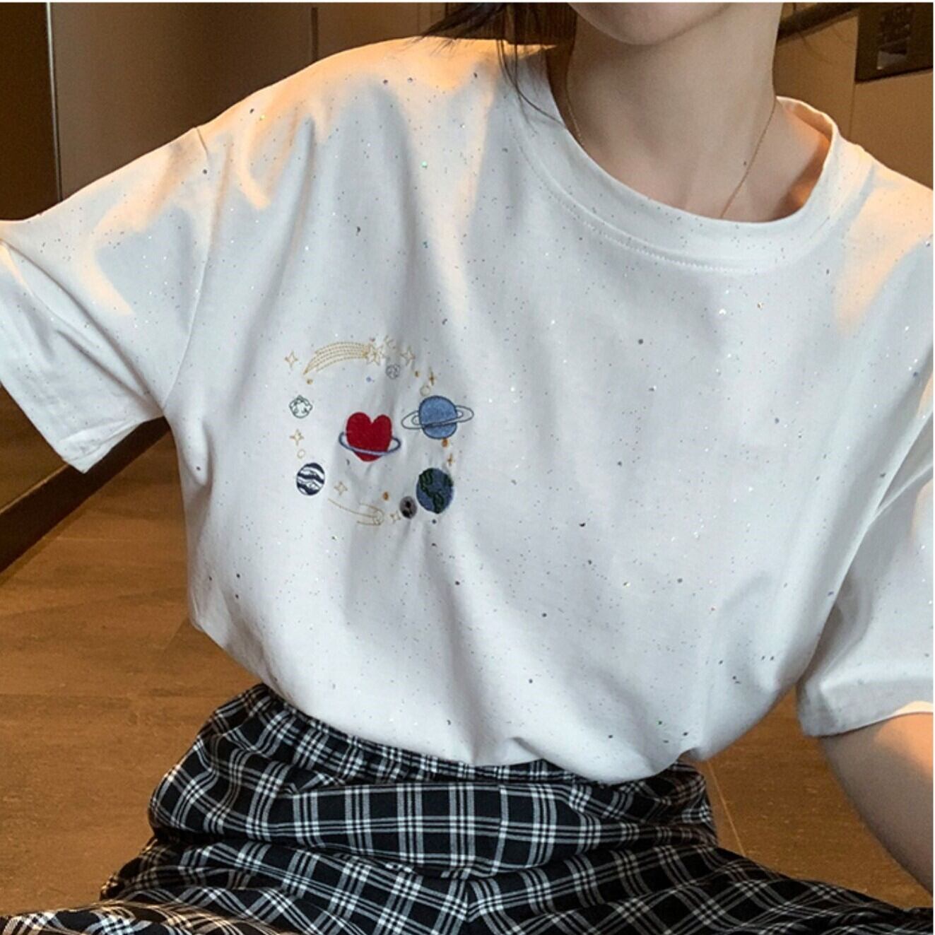 トップス レディース Tシャツ お家コーデ 半袖 ラウンドネック かわいい 大人可愛い おしゃれ お洒落 ナチュラル こなれ感 ラブリー キュート ガーリー 抜け感 爽やか 主役級 存在感 ハート 宇宙 惑星 スパンコール キラキラ 学生 通学 デート お出かけ 休日 リゾート カフェ巡り お買い物 フリーサイズ ゆったり ゆる オーバーサイズ ホワイト 春 夏 10代 20代 30代 ママ 韓国 韓国系 着回し 普段使い 体型カバー モテ トレンド 流行 インスタ映え M L XL 2XL 送料無料