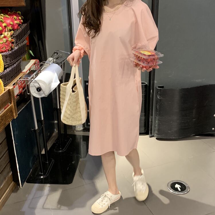 ワンピース レディース 送料無料 ラウンド ネック 半袖 パフスリーブ ルーズ 膝丈 かわいい 大人可愛い きれいめ 上品 エレガント 清楚 フェミニン おしゃれ お洒落 お嬢様 おとな ナチュラル ラブリー キュート ガーリー リラックス レトロ ロマンチック 抜け感 存在感 無地 ストライプ 学生 通学 デート お出かけ フリーサイズ ピンク カフェ巡り 散歩 お買い物 夏 20代 30代 40代 50代 韓国 韓国系 着回し 普段使い 体型カバー ファッション コーデ モテ 体型カバー