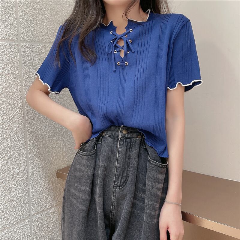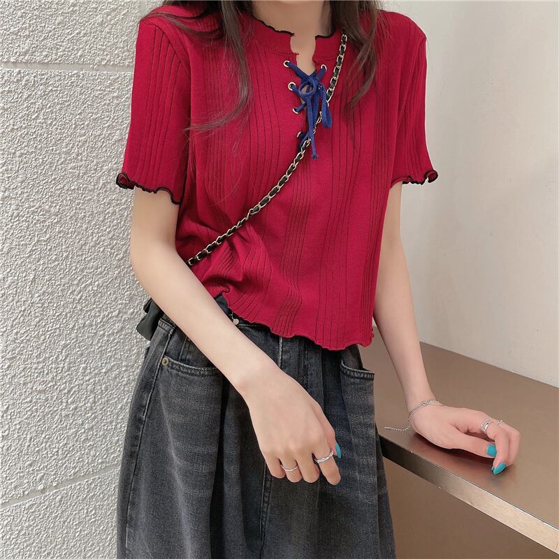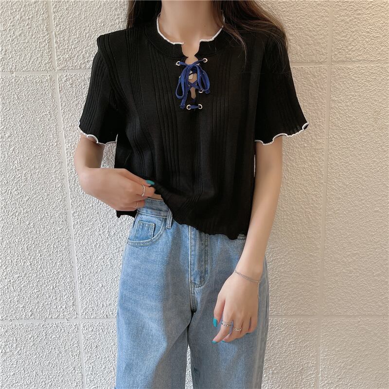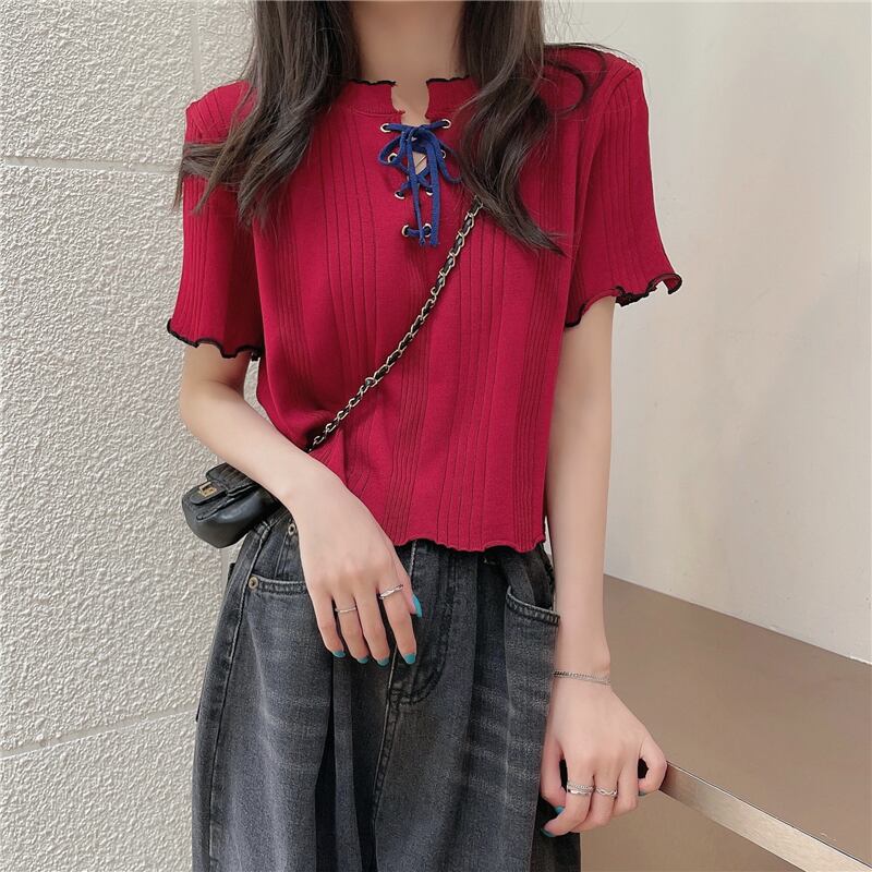 トップス レディース Tシャツ 6カラー ブラック ホワイト アプリコット レッド イエロー ブルー カラバリ フリーサイズ 薄手 半袖 メロウ バイカラー リボン キーネック 編み上げ レースアップ ショート丈 クロップド丈 こなれ感 シンプル カジュアル 大人可愛い 大人女子 おしゃれ 10代 20代 30代 通勤 通学 お出かけ 春 夏 着やせ 韓国風 ファッション コーデ インスタ映え オフィス OL 学生 フェミニン ガーリー デート 女子会 休日 イベント 旅行 送料無料 抜け感 モテ