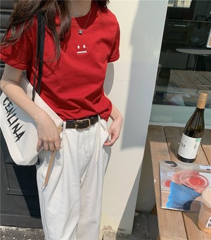 トップス レディース Tシャツ 3カラー ブラック ホワイト レッド カラバリ フリーサイズ 半袖 クルーネック フェイス 刺繍 ワンポイント ポップ ユニーク バイカラー 無地 カットソー プルオーバー シンプル カジュアル キュート ガーリー 大人可愛い 大人女子 おしゃれ 10代 20代 30代 通勤 通学 お出かけ 春 夏 秋 ロングシーズン ファッション コーデ インスタ映え オフィス 学生 普段使い デート 女子会 休日 イベント 旅行 送料無料 モテ 定番 存在感