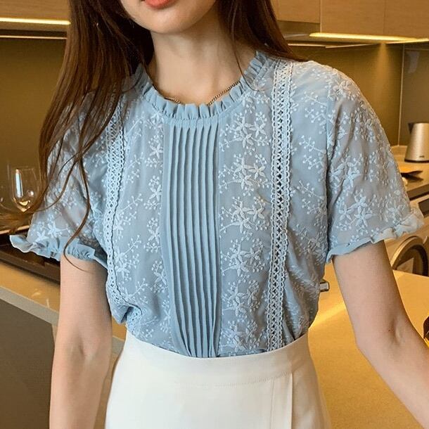 トップス レディース ブラウス 3カラー S M L XL 2XL ブルー ホワイト ピンク カラバリ シャツ 半袖 レース 花柄 フリル ピンタック 華やか シンプル きれいめ カジュアル フェミニン エレガント 上品 キュート ガーリー 大人可愛い おしゃれ 普段使い デート お出かけ 女子会 休日 旅行 通勤 通学 セレモニー お呼ばれ 着まわし 存在感 送料無料 韓国系 ファッション コーデ スタイル モテ サイズ展開豊富 大きいサイズ 春 夏 10代 20代 30代 40代 50代