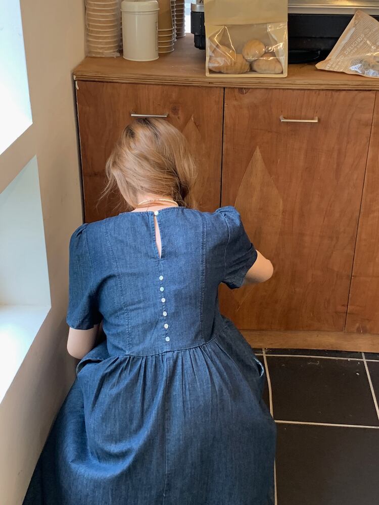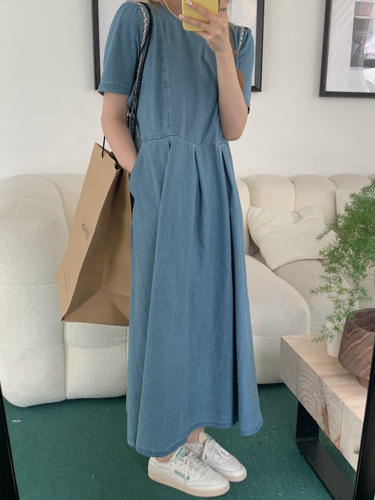 程よくゆったりとしたAラインシルエットのデニムワンピース。