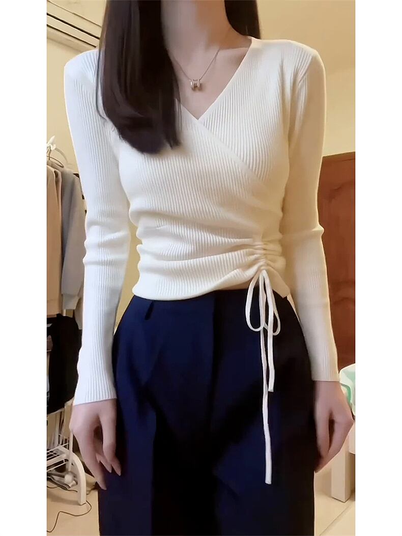 トップス レディース ニット セーター ショート丈 長袖 Vネック カシュクール スリム タイト 細身 リブ かわいい 大人可愛い きれいめ シンプル カジュアル 上品 エレガント シック おしゃれ 綺麗 お嬢様 クール モード系 おとな ナチュラル こなれ感 ガーリー アンティーク 抜け感 きちんと感 無地 OL 通勤 デート お出かけ 女子会 S M L XL 2XL 3XL ホワイト 春 秋 20代 30代 40代 50代 韓国 韓国系 着回し 普段使い 定番 ファッション コーデ モテ 送料無料