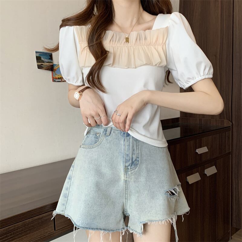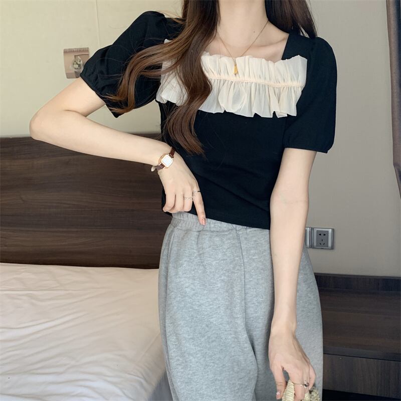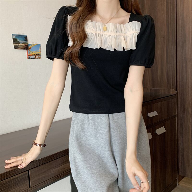 トップス レディース シャツ Tシャツ 半袖 パフスリーブ スクエアネック ショート丈 フリル フロントフリル 切り替え ドッキング かわいい 大人可愛い きれいめ 上品 エレガント 清楚 フェミニン おしゃれ おとな ナチュラル こなれ感 ラブリー キュート ガーリー 個性的 抜け感 華やか 爽やか 無地 OL 通勤 デート お出かけ 女子会 リゾート 旅行 美術館巡り アート鑑賞 街歩き M L XL 2XL ブラック 黒 ホワイト 白 春 夏 10代 20代 30代 韓国 着回し 普段使い 送料無料