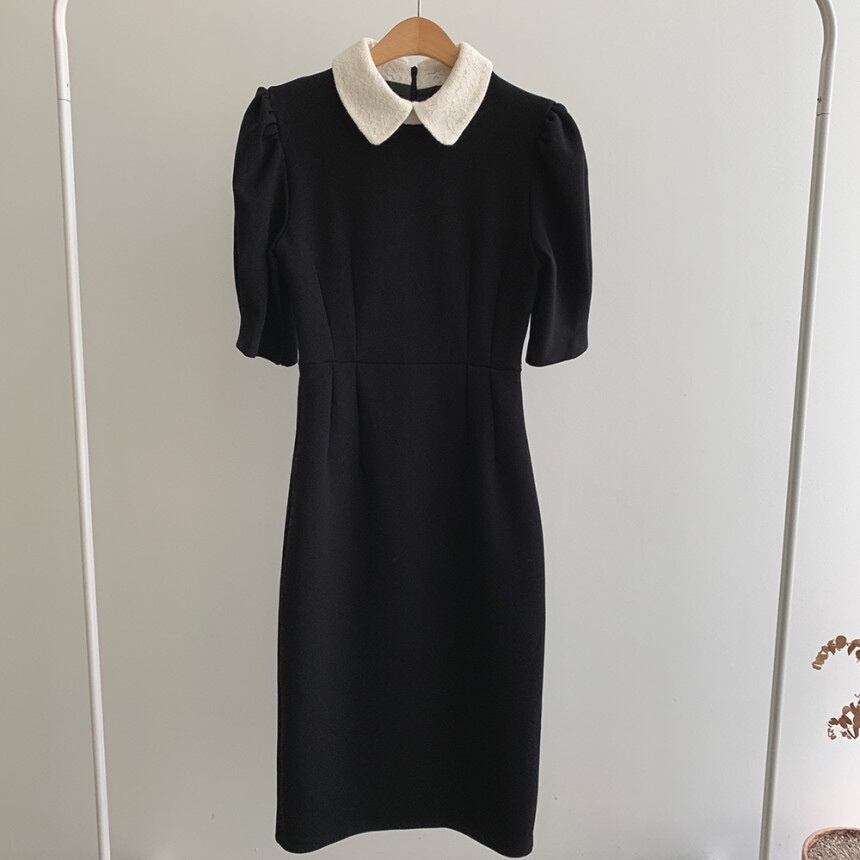 ワンピース レディース ロングワンピース ロング丈 半袖 パフスリーブ 襟付き 丸襟 細身 Iライン ウエストマーク バックスリット ファスナー バックファスナー 送料無料 カワイイ 大人可愛い きれいめ シンプル 上品 エレガント 清楚 お嬢様 フォーマル おとな こなれ感 レトロ ロマンチック 無地 ワンサイズ OL 学生 デート ブラック 黒 春 夏 秋 記念日 入学式 卒業式 結婚式 披露宴 お祝い行事 ブラックワンピシンプルワンピ10代 20代 30代 韓国系 重ね着 脚長 送料無料