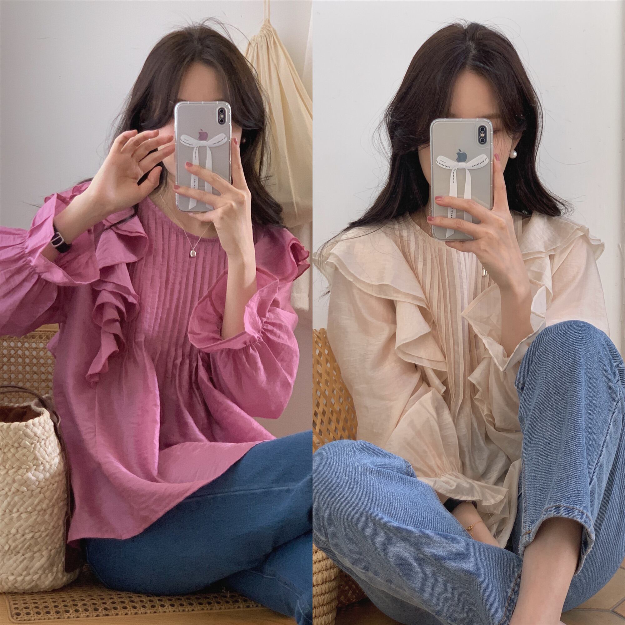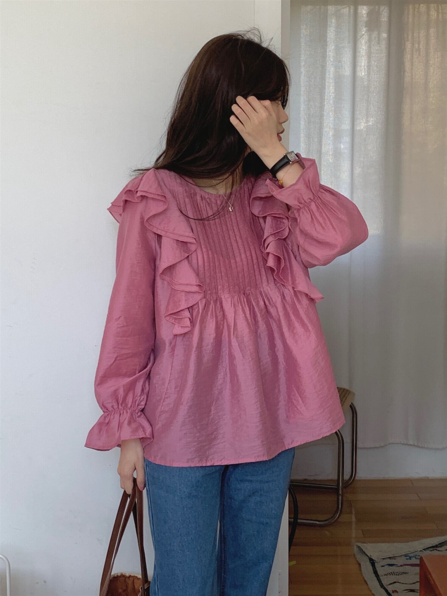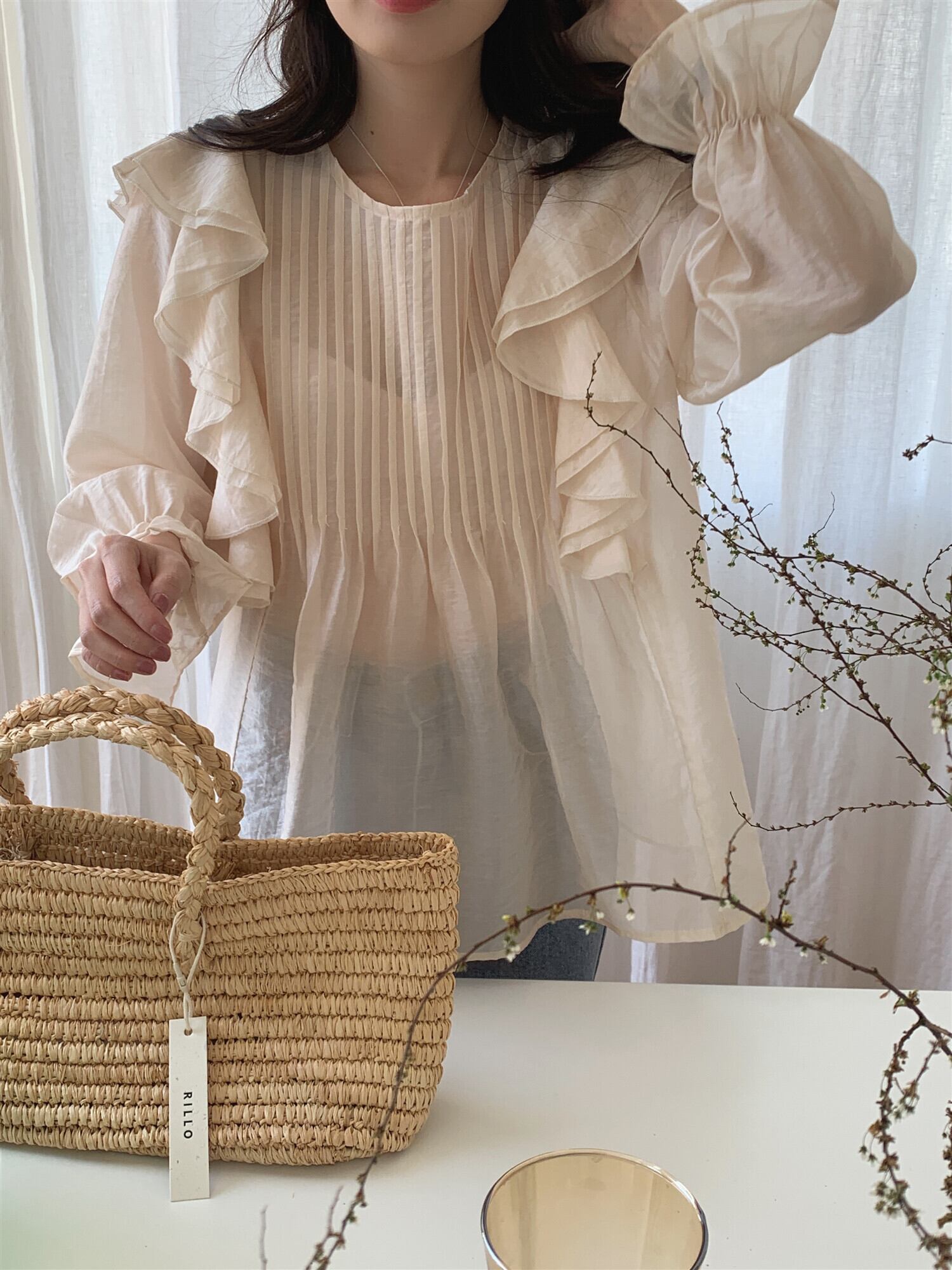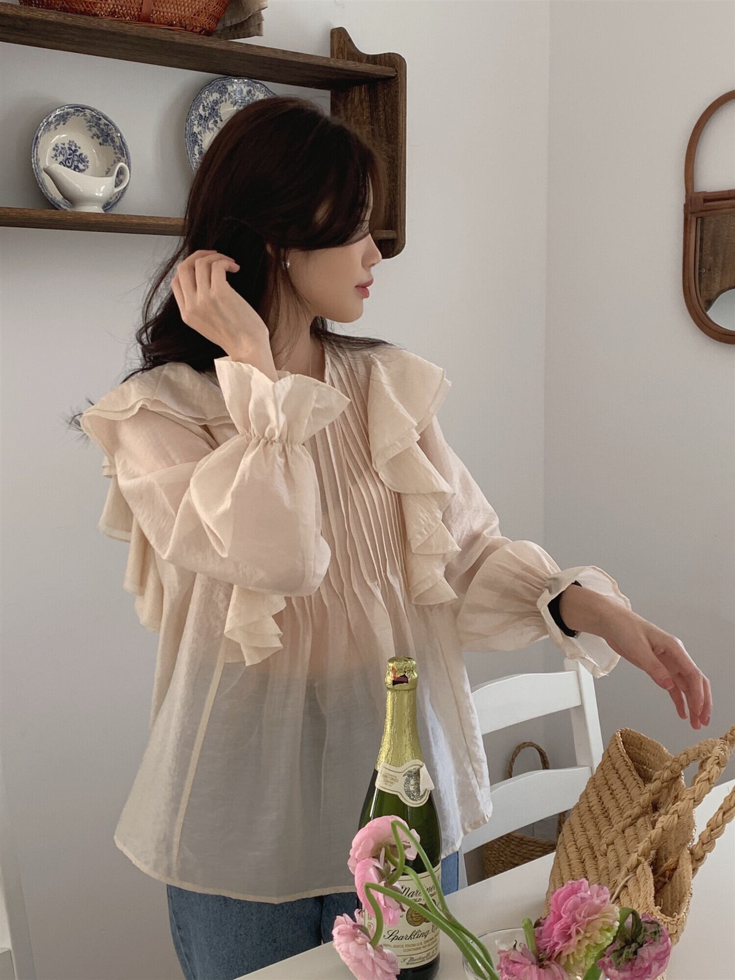 トップス レディース 2色 シャツ 袖あり 長袖 ボリューム袖 パフスリーブ ラウンドネック ノーカラー Iライン 切り替え ゆったり フリル 透け感 かわいい 大人可愛い きれいめ 上品 おしゃれ ナチュラル こなれ感 ラブリー キュート ガーリー ロマンチック 華やか 無地 OL 学生 デート お出かけ リゾート 旅行 街歩き アプリコット ラズベリー 春 夏 秋 10代 20代 30代 幼稚園ママ お迎えコーデ 韓国系 着回し 普段使い 体型カバー