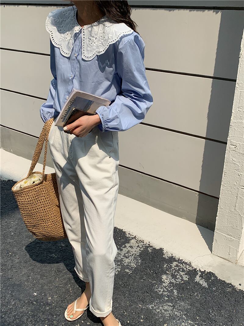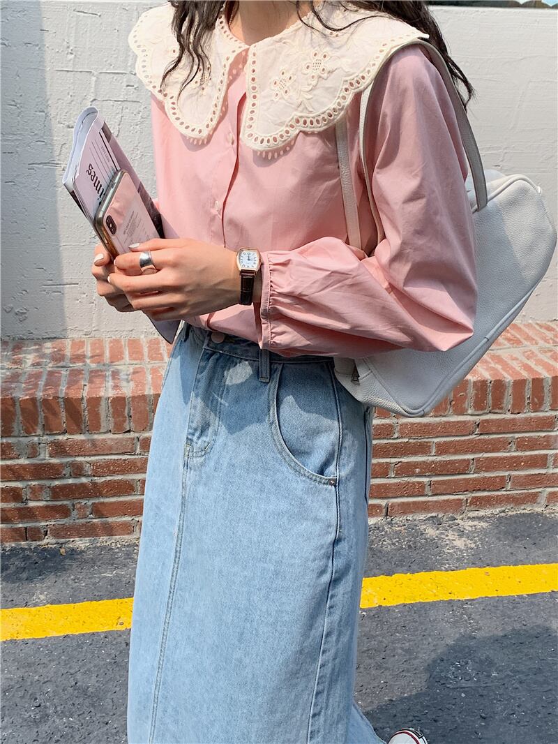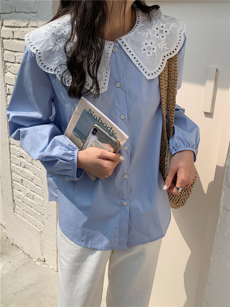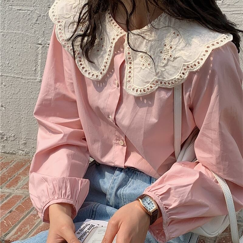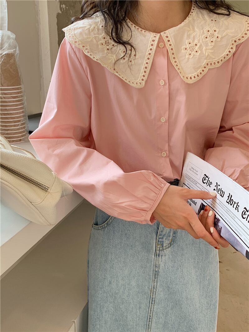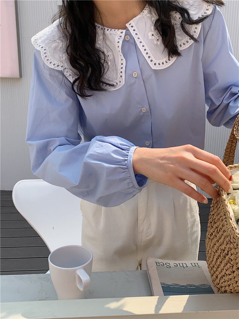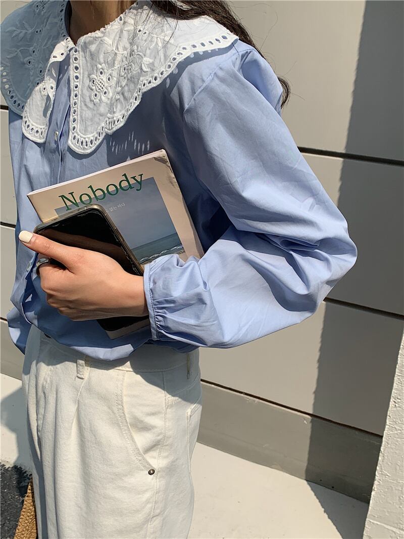 トップス レディース シャツ ブラウス ネルシャツ パンチングレース ラージカラー ブルー ピンク ワンサイズ レース襟 ビックカラー セーラーカラー 長袖 襟付き かわいい 大人可愛い シンプル カジュアル 大人 おしゃれ お洒落 かっこいい レトロ 大人可愛い ガーリー リラックス ナチュラル こなれ感 ラフ 送料無料 ゆったり ゆる 春 秋 冬 10代 20代 30代 通勤 OL 通学 ママ デート お出かけ 送料無料 女子会 休日 旅行 着回し 普段使い 重ね着 韓国系