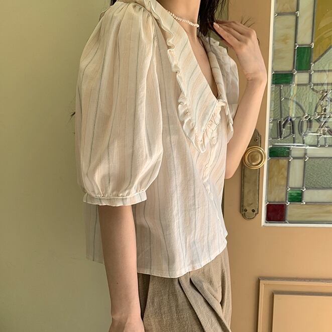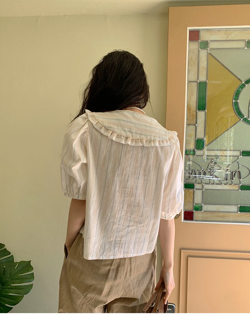 大きめなフリル付き襟とストライプが大人可愛いブラウス♪