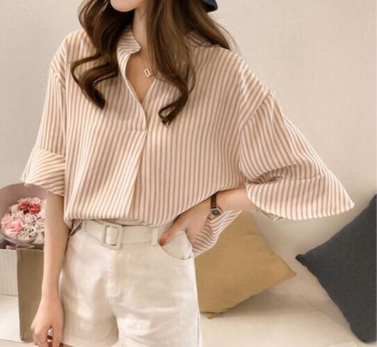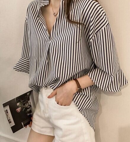 トップス レディース シャツ ブラウス 7分袖 七分袖 3色 かわいい 大人可愛い きれいめ カジュアル 上品 清楚 おしゃれ お洒落 かっこいい クール おとな ナチュラル こなれ感 リラックス ロマンチック 抜け感 爽やか 主役級 存在感 ストライプ オフィス ビジネス OL 通勤 学生 通学 デート お出かけ M L XL 2XL 3XL 大きいサイズ ベージュ ブルー ネイビー 春 夏 20代 30代 40代 韓国 韓国系 着回し 普段使い 体型カバー インスタ映え 送料無料