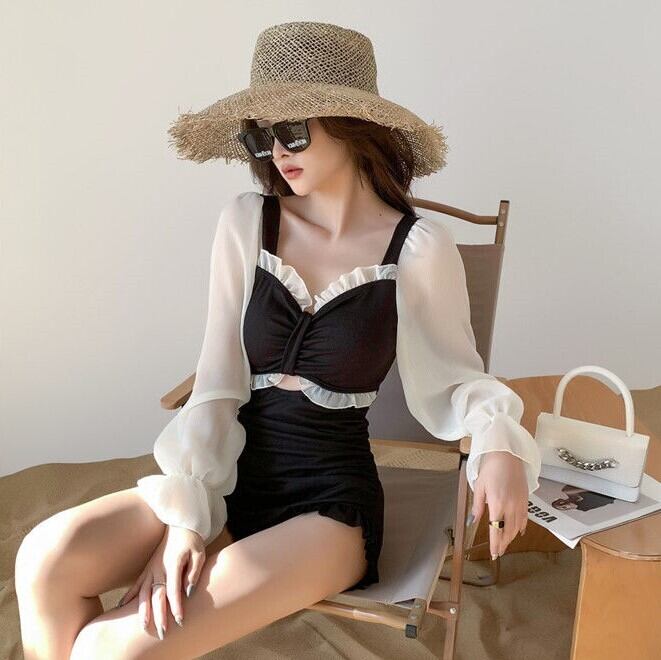 水着 レディース ワンピース水着 ワンピース スイムウェア レース フリル 長袖 シースルー 透け感 ポエットスリーブ かわいい 大人可愛い 清楚 フェミニン おしゃれ お洒落 おとな ナチュラル こなれ感 ラブリー キュート ガーリー ロマンチック 抜け感 S M L XL ブラック 黒 ブルー 青 夏 学生 休日 リゾート 旅行 海 プール バイカラー 10代 20代 30代 体型カバー 日焼け対策 紫外線対策 韓国 韓国系 ファッション コーデ お揃い モテ トレンド 流行 インスタ 送料無料