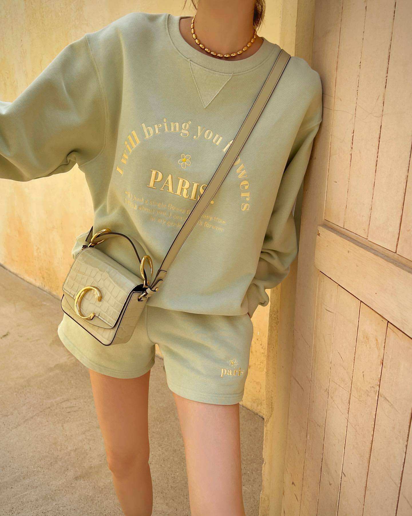 リラックス感とおしゃれを両立したロゴ入りスウェットと、ミニマルなデザインが新鮮なショートパンツのセットアップ。