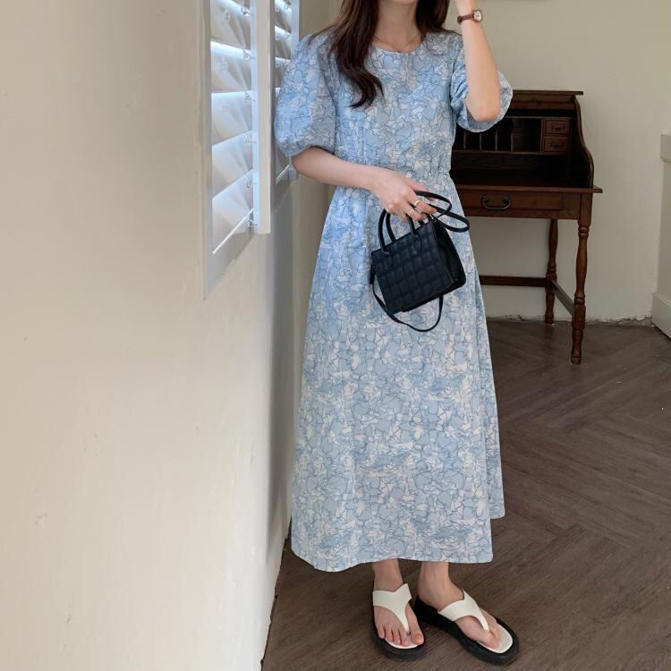花柄にふんわりとしたパフスリーブがフェミニンなロングワンピース。