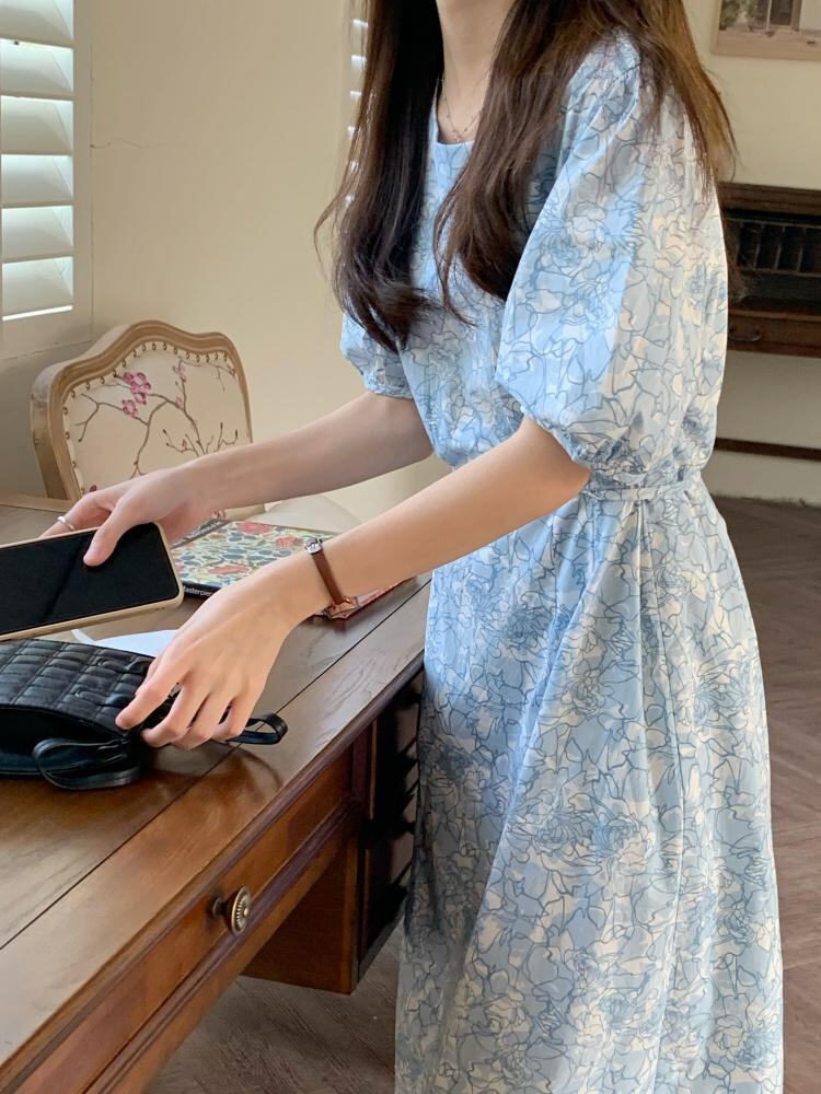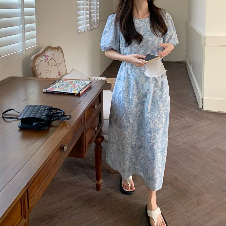 ワンピース レディース ロングワンピース M L XL 2XL 3XL 4XL 大きいサイズ ブルー 花柄 フローラル柄 プリント ロング丈 半袖 ラウンドネック パフスリーブ ハイウエスト 脚長効果 スタイルアップ 体型カバー 大人可愛い きれいめ シンプル カジュアル ガーリー 上品 おしゃれ お洒落 大人女子 こなれ感 キュート 主役級 存在感 春 夏 サマードレス 10代 20代 30代 40代 デート 女子会 普段使い お呼ばれ イベント 送料無料 ファッション スタイル モテ インスタ
