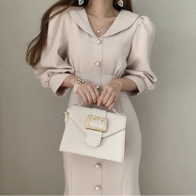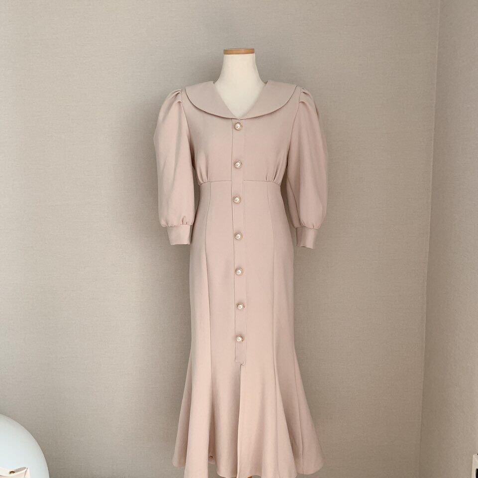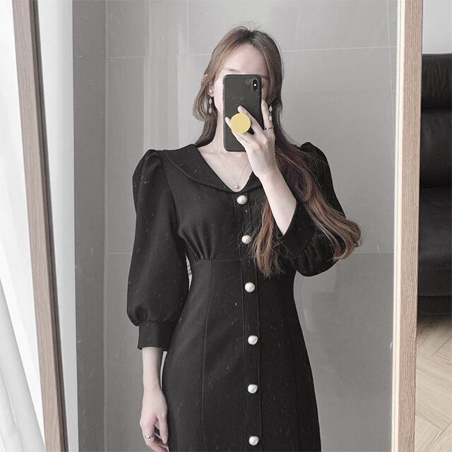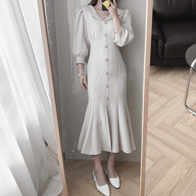 ワンピース レディース ロングワンピース 2カラー S M L アイボリー ブラック カラバリ 7分袖 無地 パールボタン 丸襟 パフスリーブ マーメイドシルエット ハイウエスト スタイルアップ 脚長効果 体型カバー シンプル きれいめ カジュアル フェミニン ガーリー 上品 大人可愛い おしゃれ 普段使い イベント デート お出かけ 休日 通勤 旅行 お呼ばれ ファッション コーデ スタイル モテ 着まわし 送料無料 存在感 こなれ感 春 夏 秋 20代 30代 40代