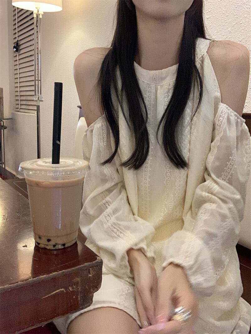 ワンピース レディース ミニ丈 オープンショルダー ホルターネック 長袖 シースルー 花柄 レース かわいい 大人可愛い きれいめ 上品 エレガント 清楚 フェミニン おしゃれ お洒落 お嬢様 ナチュラル ラブリー キュート ガーリー レトロ ロマンチック 抜け感 爽やか 主役級 存在感 学生 通学 デート お出かけ 女子会 旅行 カフェ巡り お買い物 ベージュ S M L XL 春 夏 秋 10代 20代 韓国系 着回し 普段使い 体型カバー プチプラ モテ トレンド 流行 インスタ映え 送料無料