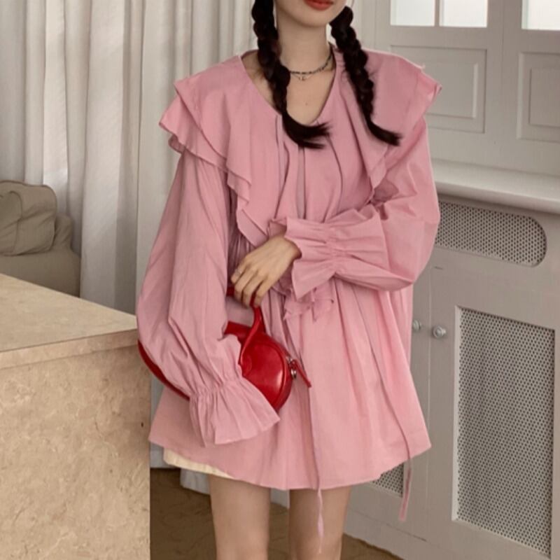トップス レディース シャツ ブラウス 長袖 ボリューム袖 Vネック フリル ミドル丈 透け感 かわいい 大人可愛い きれいめ シンプル カジュアル 大人 上品 おしゃれ レトロ 大人女子 ラフ ガーリー キュート ルーズ 個性的 セクシー エレガント とろみ感 S M L XL ゆったり ホワイト ピンク 無地 春 夏 10代 20代 30代 学生 通学 デート お出かけ 女子会 着回し 普段使い 韓国系 ファッション コーデ スタイル 楽ちん モテ 体型カバー トレンド 流行 インスタ映え 送料無料
