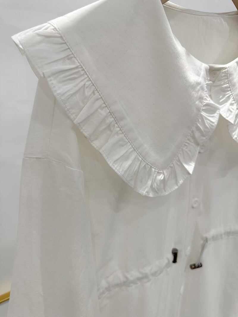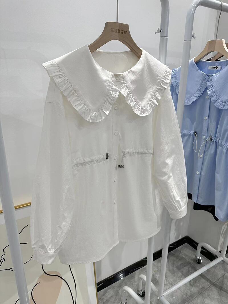 トップス レディース シャツ ブラウス 長袖 ドールカラー ビックカラー フリルカラー フリル ウエストマーク かわいい 大人可愛い きれいめ シンプル カジュアル 清楚 フェミニン シック おしゃれ 綺麗 お嬢様 ナチュラル こなれ感 ラフ ラブリー キュート ガーリー 個性的 レトロ 抜け感 爽やか 存在感 無地 ストライプ 学生 通学 デート お出かけ 女子会 休日 散歩 フリーサイズ ホワイト ブラック ブルー 春 秋 10代 20代 30代 韓国 着回し 普段使い 体型カバー 楽ちん 送料無料