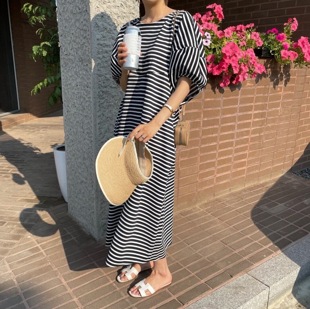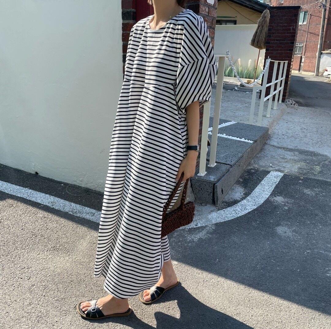 ワンピース レディース ロングワンピース 送料無料 ラウンドネック 半袖 パフスリーブ ルーズ ミモレ丈 かわいい 大人可愛い きれいめ 上品 清楚 フェミニン おしゃれ お洒落 お嬢様 おとな ナチュラル ラブリー キュート ガーリー リラックス レトロ ロマンチック 抜け感 存在感 ストライプ 学生 通学 デート お出かけ フリーサイズ ストライプ カフェ巡り 散歩 お買い物 夏 20代 30代 40代 50代 韓国 韓国系 着回し 普段使い 体型カバー ファッション ボーダー モテ 体型カバー