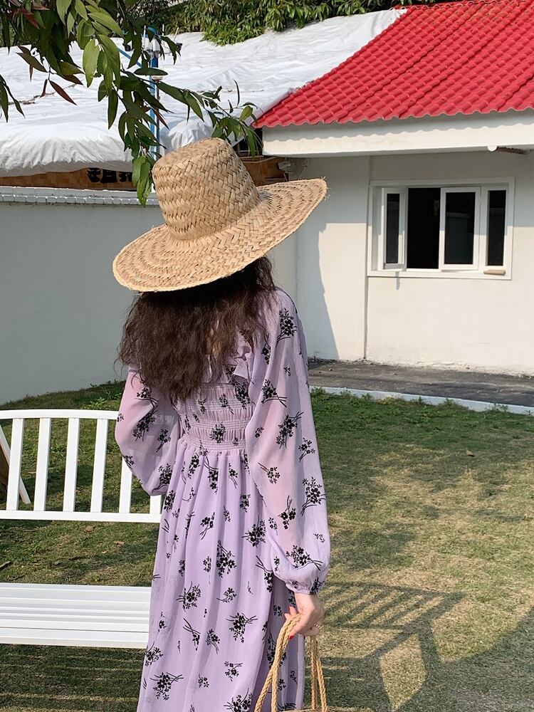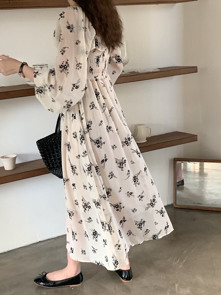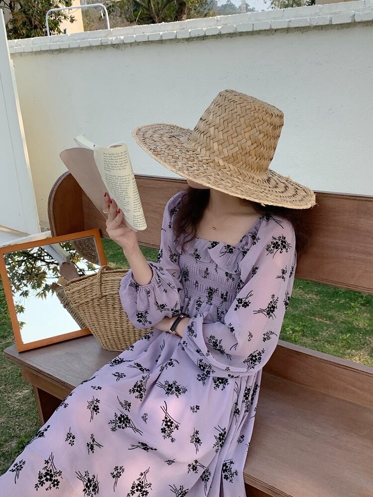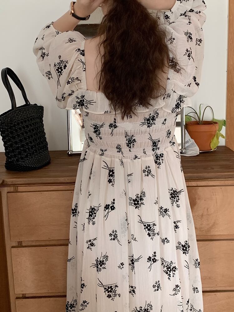 ワンピース レディース フレアワンピース ロング丈 マキシ丈 花柄 小花柄 フラワー 総柄 リラクシー 袖あり 長袖 パフスリーブ スクエアネック フレア 裾フレア プルオーバー ウエストゴム ギャザー かわいい 大人可愛い きれいめ シンプル 上品 清楚 おしゃれ お嬢様 おとな ナチュラル こなれ感 ラブリー キュート ガーリー ホワイト 白 パープル 紫 春 夏 秋 記念日 10代 20代 30代 韓国系 韓国 体型カバー 楽ちん リゾート 海 プールサイド インスタ お呼ばれ 送料無料