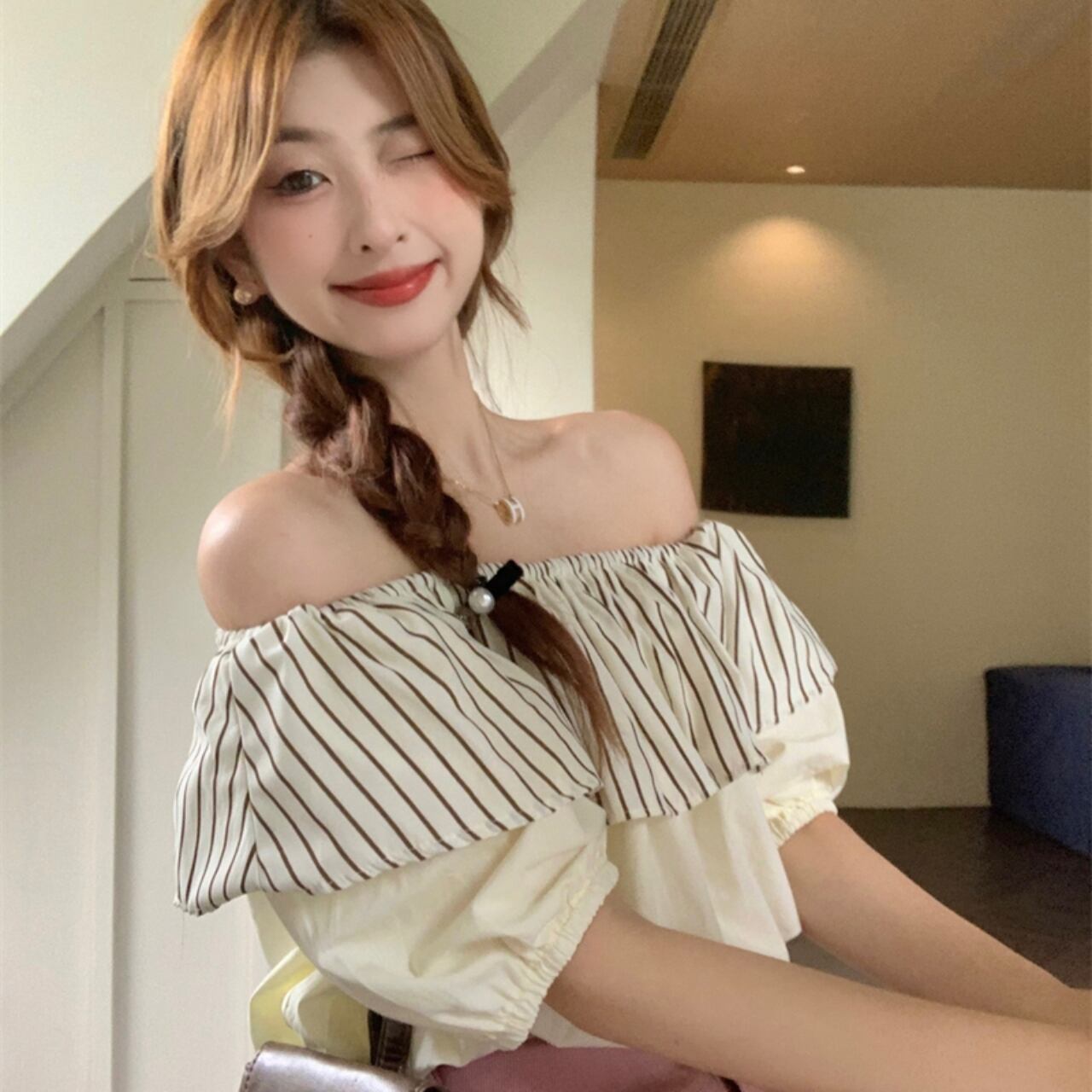 オフショルダーで、肩を抜いたフェミニンなスタイルを演出するストライプフリルトップス。