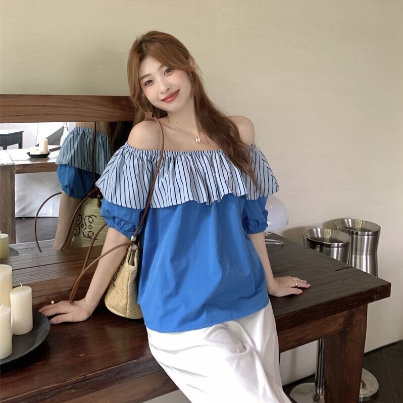 トップス レディース オフショルダー シャツ 肩見せ パフスリーブ 半袖 フリル かわいい 大人可愛い きれいめ シンプル カジュアル 大人 上品 清楚 フェミニン おしゃれ かっこいい 大人女子 ラブリー キュート ガーリー モダン セクシー エレガント 抜け感 存在感 主役級 ストライプ 春 夏 秋 10代 20代 30代 40代 通勤 学生 通学 デート お出かけ 女子会 休日 着回し 普段使い 韓国 コーデ スタイル 合コン 散歩 旅行 爽やか アプリコット ブルー 青 フリーサイズ 送料無料