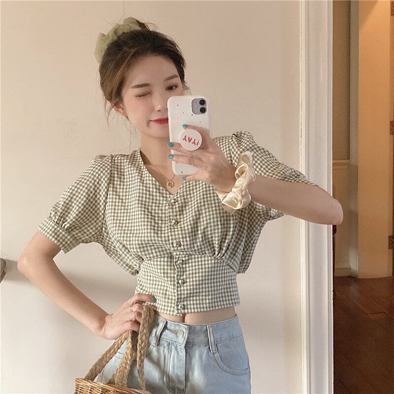 トップス レディース シャツ ブラウス ショート ショート丈 クロップド 半袖 ギンガムチェック Vネック ハイウエスト バックコンシャス リボン かわいい 大人可愛い おしゃれ お洒落 レトロ 大人女子 こなれ感 ラブリー キュート ガーリー 主役級 存在感 チェック柄 夏 10代 20代 学生 通学 デート お出かけ 休日 着回し 普段使い 韓国系 ファッション コーデ スタイル モテ プチプラ トレンド 流行 インスタ映え ワンサイズ グリーン ブルー イエロー 送料無料