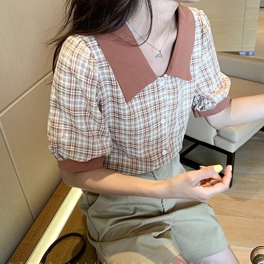 トップス レディース シャツ ブラウス M L XL 2XL 3XL 4XL 大きいサイズ チェック柄 レトロ ショート ショート丈 襟付き クロップド 半袖 パフスリーブ バイカラー かわいい 大人可愛い おしゃれ お洒落 レトロ 大人女子 こなれ感 ラブリー キュート ガーリー 主役級 存在感 チェック柄 春 夏 10代 20代 学生 通学 デート お出かけ 休日 着回し 普段使い 韓国 韓国系ファッション コーデ スタイル モテ プチプラ トレンド 流行 インスタ ブラック 黒 オレンジ 送料無料