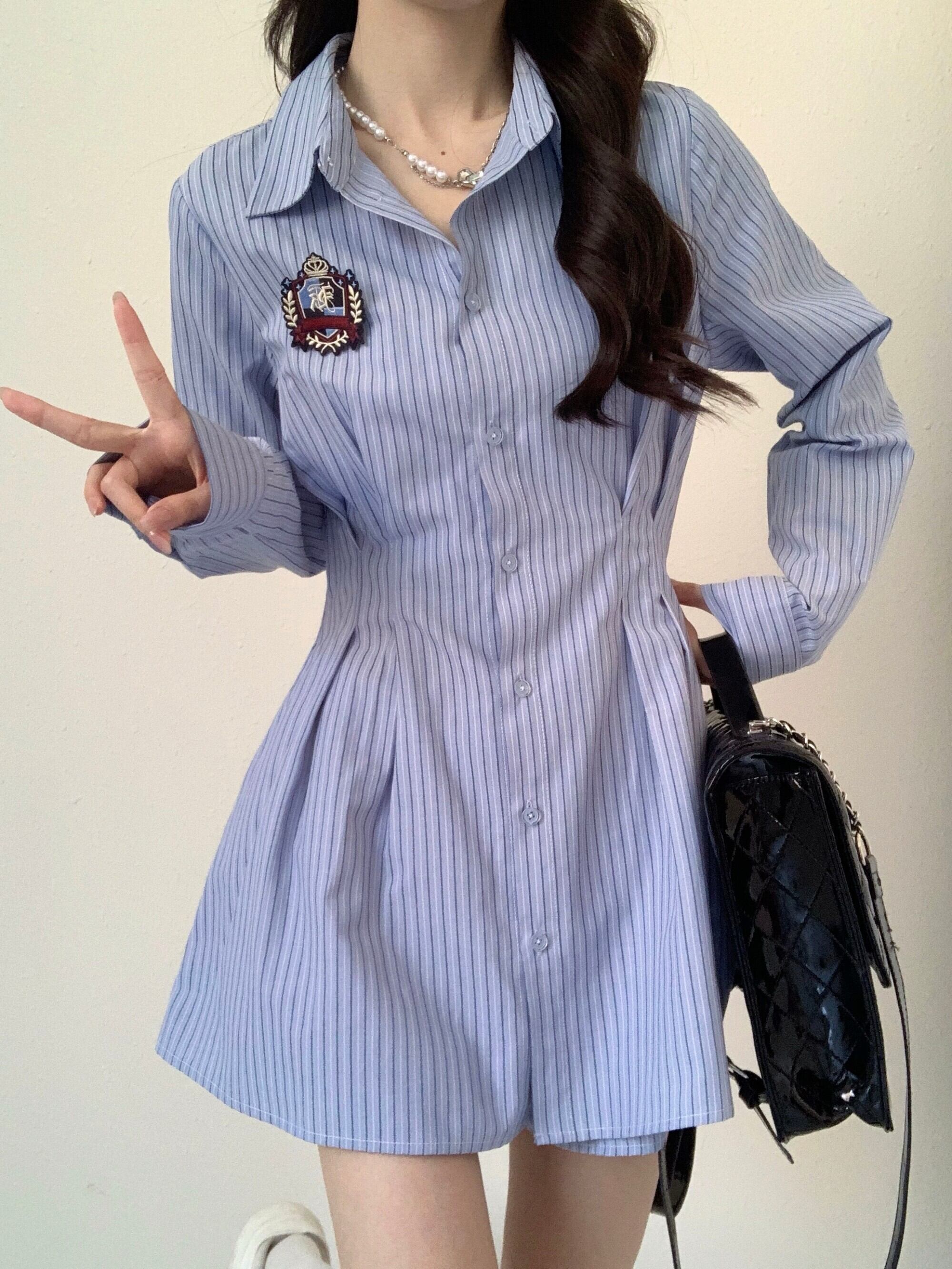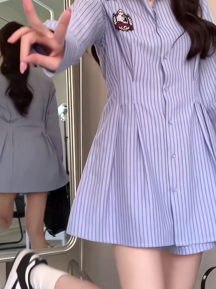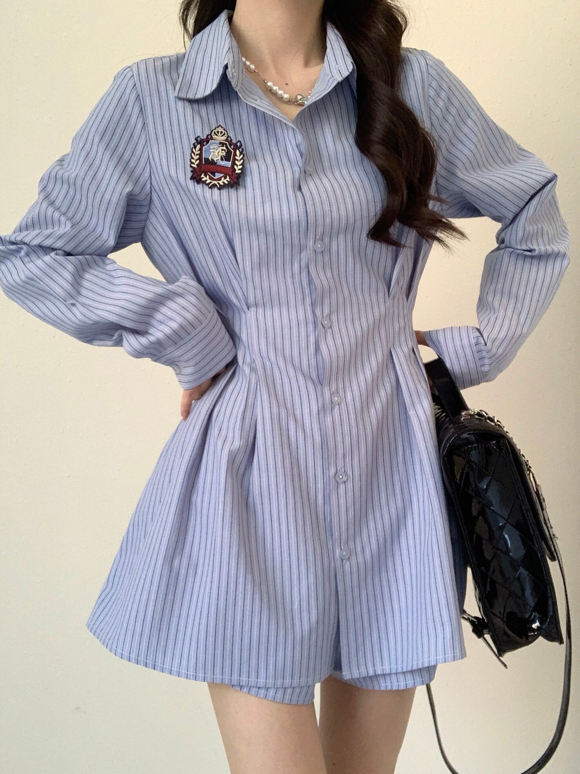 【着用レビュー】セットアップ レディース ショートパンツ シャツワンピース ミニ丈 ショート丈 長袖 襟付き ポロカラー かわいい 大人可愛い きれいめ シンプル カジュアル エレガント 清楚 フェミニン シック おしゃれ 綺麗 モード系 おとな ナチュラル こなれ感 ラフ ラブリー キュート ガーリー 個性的 爽やか ストライプ 学生 通学 デート お出かけ 女子会 休日 イベント S M L ブルー 青 春 秋 上下セット 2点セット ツーピース 10代 20代 韓国系 着回し 普段使い 送料無料