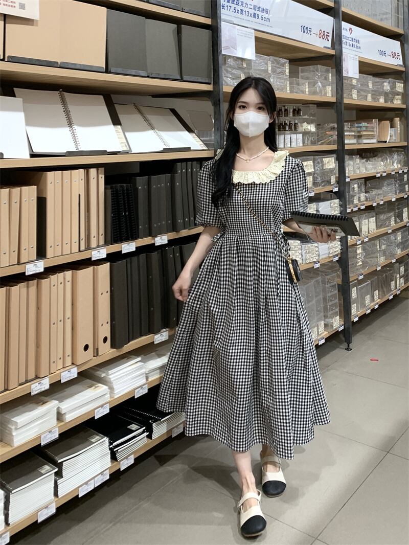 ワンピース レディース ロング丈 ギンガムチェック タック 襟付き ビックカラー 半袖ワンピース りぼん リボン ギャザー 袖ありワンピース サマードレス フレア ハイウエスト スタイルアップ 脚長効果 体型カバー シンプル フェミニン キュート ガーリー 上品 大人可愛い おしゃれ 普段使い イベント デート お出かけ 休日 リゾート 旅行 ファッション コーデ モテ 存在感 こなれ感 春 夏 ブラック フリーサイズ 10代 20代 30代 送料無料