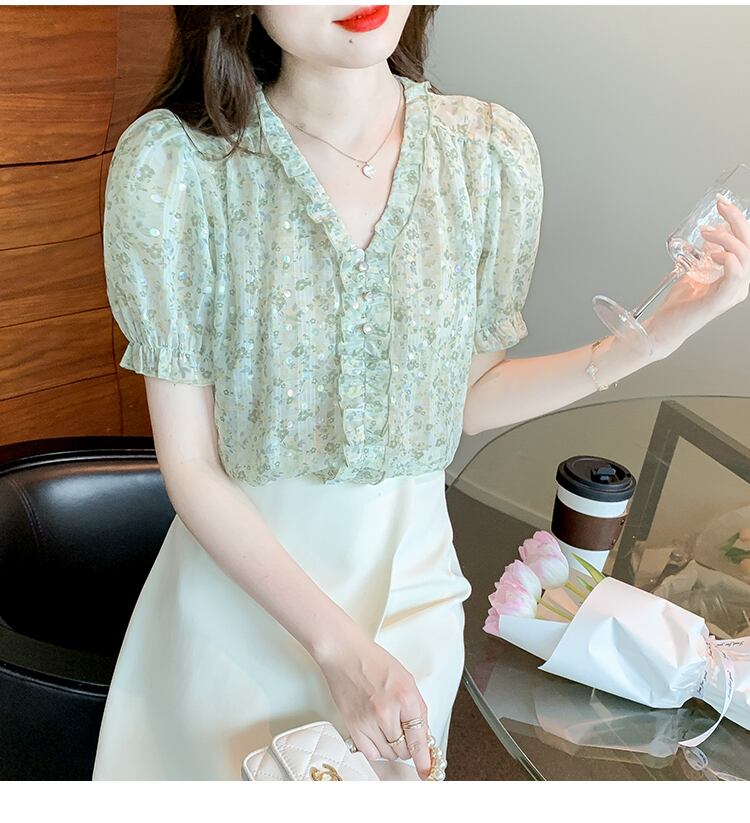 トップス レディース シャツ ブラウス 半袖 Vネック シフォン フリル ボタン かわいい 大人可愛い きれいめ 上品 エレガント 清楚 フェミニン おしゃれ お洒落 綺麗 お嬢様 こなれ感 ラブリー キュート ガーリー ロマンチック 抜け感 華やか 主役級 存在感 花柄 フラワー OL 通勤 デート お出かけ 女子会 S M L XL 2XL 緑 グリーン 夏 20代 30代 40代 韓国 韓国系 着回し 普段使い ファッション コーデ モテ トレンド 流行 インスタ 送料無料