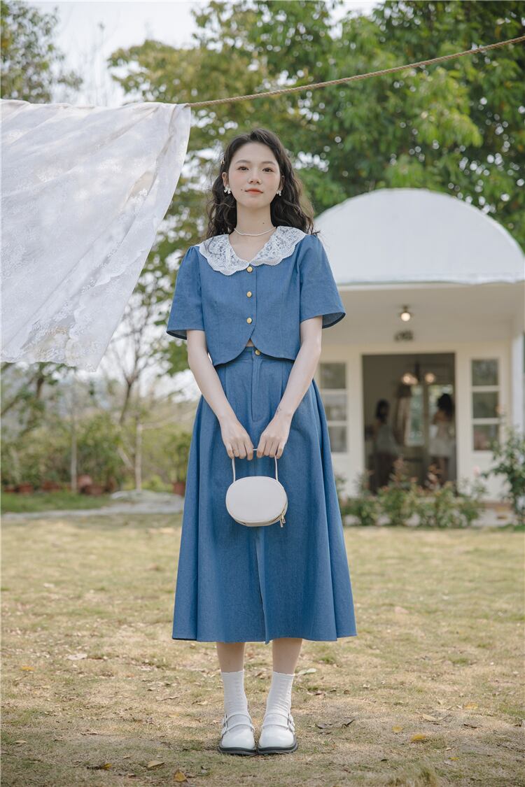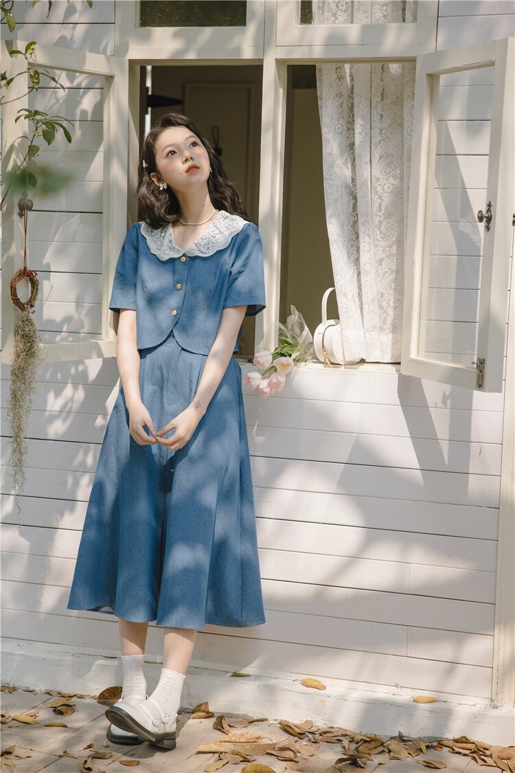 レース襟が映えるデニム仕立ての上下セットアップです。