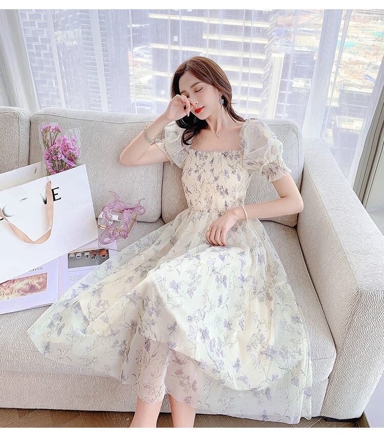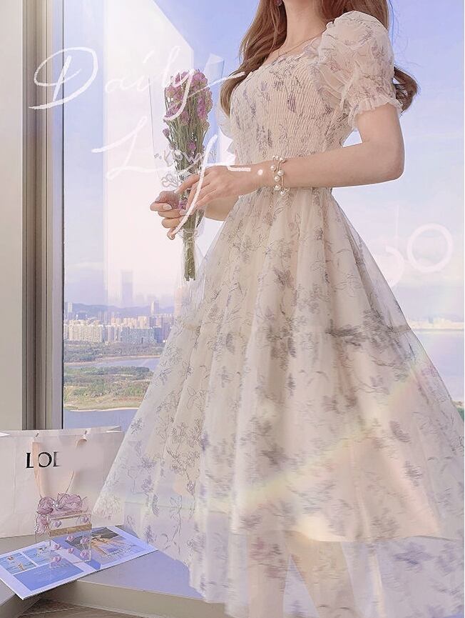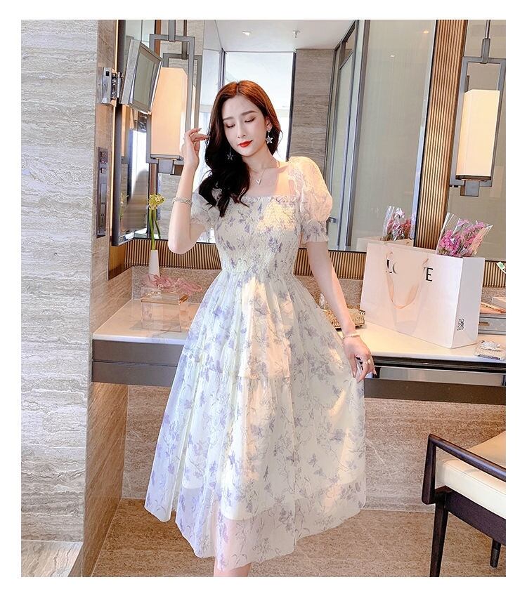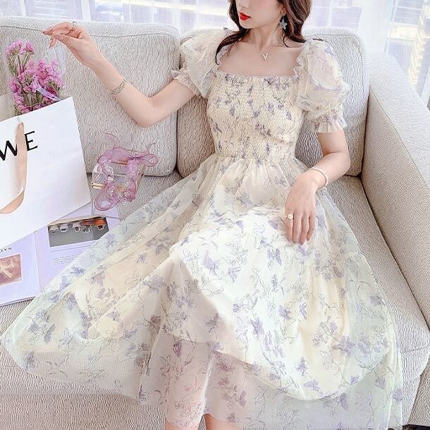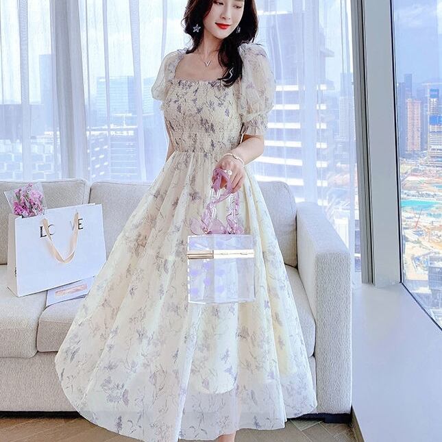 ワンピース レディース ドレス フレアワンピース S M L XL ミモレ丈 半袖 花柄 パフスリーブ スクエアネック フリル Aライン シフォン ウエストマーク 花柄 小花柄 フラワー かわいい 大人可愛い シンプル エレガント 上品 清楚 おしゃれ 綺麗 きれいめ お嬢様 おとな ナチュラル ガーリー 華やか 通勤 学生 通学 デート お出かけ 女子会 パーティー リゾート 旅行 ホワイト 春 夏 10代 20代 30代 ママ 着回しインスタ映え 体型カバー 春夏ワンピ 送料無料