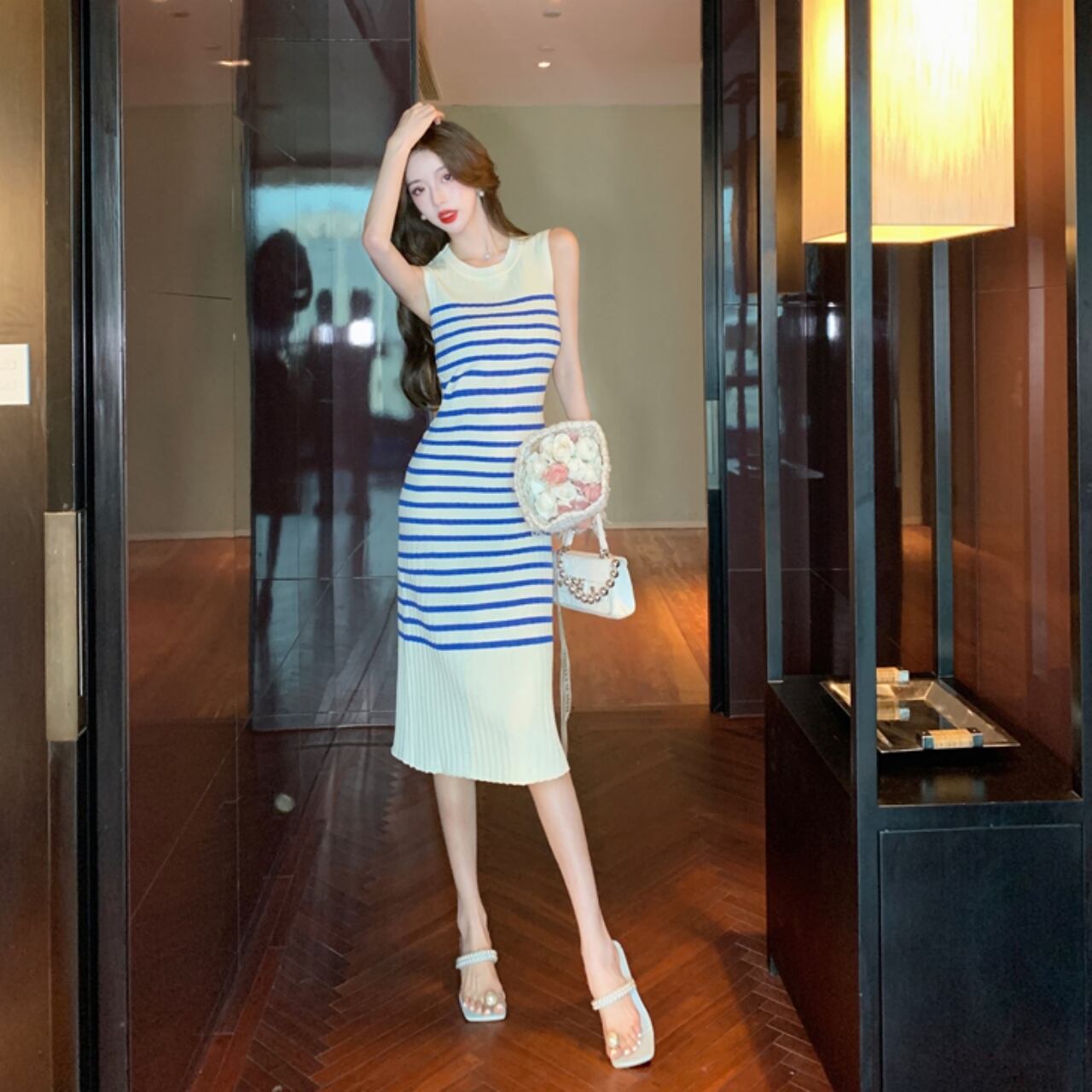 細身のシルエットがスタイルアップを叶えるボーダー柄のノースリーブワンピース。